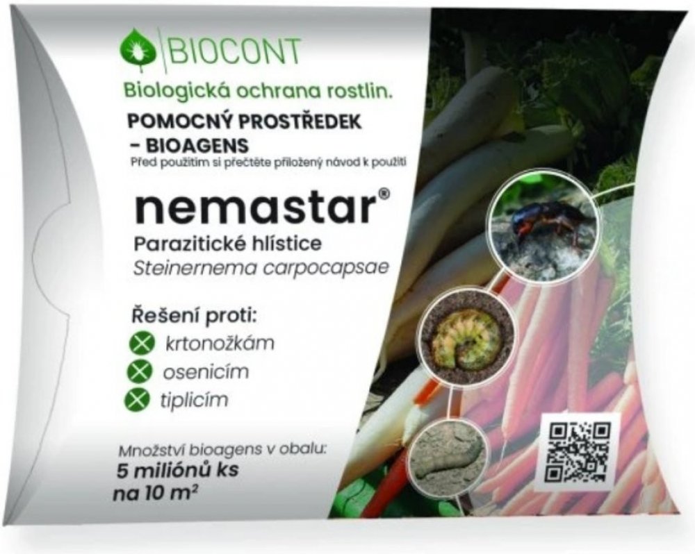 Nemastar je biologický prostředek s parazitickými hlísticemi (Steinernema carpocapsae), který účinně působí proti larvám škůdců jako jsou krtonožky, osenice a tiplice. Larvy po napadení hynou do 48 hodin. ✅ Jak Nemastar funguje? Po aplikaci se hlístice dostávají do těla škůdce, kde začnou parazitovat. Výsledkem je rychlá smrt hostitele a rozvoj další generace hlístic uvnitř jeho těla. Tak dochází ...