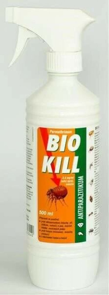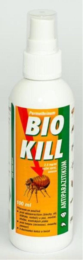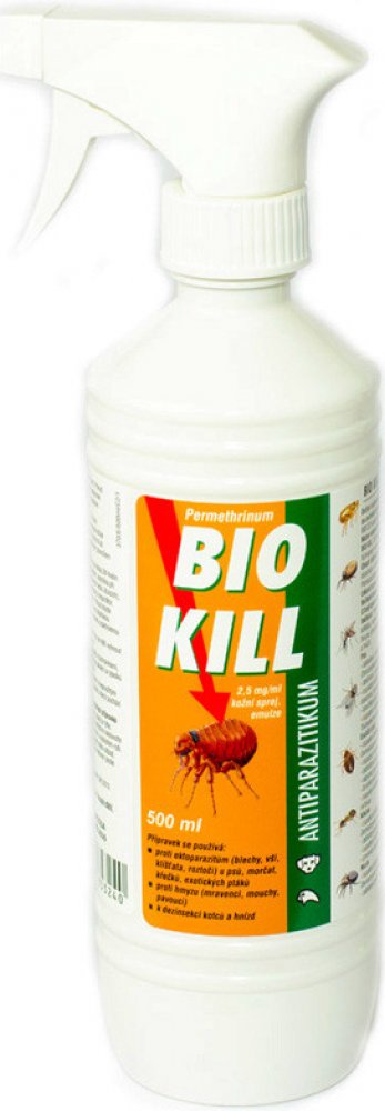 Sprej proti parazitům pro psy, morčata, křečky a exotické ptáky Lze použít i k ošetření pelíšků a hnízd Účinkuje na blechy, klíšťata, vši, všenky, čmelíky a další… Aplikace dle hmotnosti Nepoužívat u koček! Zabránit styku koček s ošetřenými zvířaty. Obsah léčivých a ostatních látek: 1 ml bílé mléčné emulze obsahuje: Léčivá látka: Permethrinum 2,5 mg Pomocné látky: Benzylalkohol 10,0 mg Léková forma: Kožní sprej, emulze Indikace: Přípravek se používá proti ektoparazitům (blechy, vši, klíšťata, roztoči) u psů, morčat, křečků, exotických ptáků, proti hmyzu (mravenci, mouchy, pavouci) a k dezinsekci kotců a hnízd. Pes zablešení, ctenocefalidóza, způsobená blechami rodu Ctenocephalides zejména C. canis a felis zavšivení, pedikulóza, způsobené původci Linognatus setosus, napadení klíšťaty a klíšťáky Ixodes ricinus, Haemaphysalis concinna, Dermatocentor reticulatus, Dermatocentor marginatus dravčíkovitost způsobená původci Cheyletiella yasguri napadení všenkami, trichodektóza, způsobená všenkami Trichodectes canis Exotičtí ptáci napadení klíšťaty Ixodes ricinus, Haemaphysalis concinna, Dermatocentor reticulatus, Dermatocentor marginatus napadení klíšťáky Argas vulgarit, Argas reflexus zablešení způsobená blechami Ceratophyllus gallinae vápenka způsobená původci Knemidocoptes mutans, K. pilae čmelíkovitost způsobená původcem Dermanyssus gallinae napadení klíšťáky způsobené původci Argas vulgaris, Argas reflexus Křeček napadení klíšťaty Ixodes ricinus, Haemaphysalis concinna, Dermatocentor reticulatus, Dermatocentor marginatus zablešení způsobené původci Spilopsyllus cuniculi napadení trudníky způsobené původci Demodex criceti prevence napadení svrabovkou kočičí Notoedres cati Morče napadení klíšťaty Ixodes ricinus, Haemaphysalis concinna, Dermatocentor reticulatus, Dermatocentor marginatus zablešení způsobené původci Spilopsyllus cuniculi napadení trudníky způsobené původci Demodex criceti napadení svrabovkou kočičí Notoedres cati Prevence miáz a napadení bodavým a obtížným hmyzem Komáři: Culex pipiens, Aedes vexans Muchničky: Eusimulium latipes, Prosimulium hirtipes, Odagmia ornata Pakomáři: Culicoides obsoletus, Culicoides pulicaris Ovádi: Tabanus spp. Mouchy: Musca domestica, Stomoxys calcitrans Tiplíci: Culicoides spp. Sanace prostředí: Přípravek BIO KILL 2,5 mg/ml sprej působí též v rámci prevence napadení výše uvedenými druhy. Kontraindikace: Nepoužívat u koček – přípravek je pro kočky toxický. Zamezte možnému styku koček se psy, kteří jsou ošetřeni přípravkem BIO KILL 2,5 mg/ml sprej. Nežádoucí účinky: Nejsou známy. Cílový druh zvířat: Psi, morčata, křečci, exotičtí ptáci. Dávkování pro každý druh, cesta a způsob podání: Způsob podání: Zvířata - prostředek se aplikuje proti směru srsti a peří, až se jejich kůže (peří) navlhčí. Dlouhosrstá zvířata se současně kartáčují. Dávkování: 10 mg permethrinu (tj. 4 ml přípravku) na 1 kg hmotnosti zvířete, tedy: 20 stisků aplikační pumpy na 1 kg živé hmotnosti zvířete u 100 ml balení, 4 stisky aplikační pumpy na 1 kg živé hmotnosti zvířete u 500 ml balení. Sanace prostředí: Vystříkávají se do vlhka asi 25 ml/m2, tedy: 125 stisknutí aplikační pumpy u balení 100 ml 25 stisknutí aplikační pumpy u balení 500 ml Aplikace na klece, boudy, stání a stáje. Postřik se opakuje v případě potřeby za 1-2 týdny. Před použitím dobře protřepat! Pokyny pro správné podání: Neuplatňuje se. Ochranná lhůta: Není určeno pro potravinová zvířata. Zvláštní opatření pro uchování: Uchovávejte při teplotě do 25 °C. Chraňte před přímým slunečním zářením. Nepoužívejte po uplynutí doby použitelnosti uvedené na obalu po EXP. Zvláštní upozornění: Přípravek může dráždit kůži, sliznice a alergizovat. Zabraňte kontaktu s pokožkou, očima a sliznicemi. V případě zasažení pokožky či sliznice opláchněte exponovanou část ihned po expozici velkým množstvím vody a odstraňte kontaminovaný oděv, který je v přímém kontaktu s pokožkou. V případě zasažení očí vypláchněte velkým množstvím pitné vody. Pokud se dostaví příznaky podráždění (vyrážka), alergická reakce či systémové účinky, vyhledejte lékařskou pomoc. Na dýchací trakt působí přípravek dráždivě. Používejte v dobře větraných prostorách. V případě náhodného vdechnutí přemístěte zasaženou osobu na čerstvý vzduch. Pokud dojde k dýchacím obtížím nebo se projeví systémové účinky (jako závratě, bolesti hlavy, únava, palpitace srdce aj.), vyhledejte lékaře. Po aplikaci se doporučuje po dobu 12-24 hodin omezit manipulaci se zvířaty, zejména se nedoporučuje s ošetřenými zvířaty spát. I po uplynutí této doby si po manipulaci s ošetřenými zvířaty nebo ošetřeným povrchem vždy důkladně omyjte ruce. Zabraňte kontaktu dětí s ošetřeným zvířetem po dobu 24 hodin. Při nakládání s veterinárním léčivým přípravkem, zejména při opakované aplikaci (např. v chovných zařízeních nebo útulcích), by se měly používat osobní ochranné prostředky (respirátor, ochranný oděv, brýle a neoprenové rukavice). Pokud dojde k náhodnému požití přípravku, vyhledejte ihned lékařskou pomoc a ukažte příbalovou informaci nebo etiketu praktickému lékaři. Lidé se známou přecitlivělostí na permethrin by se měli vyhnout kontaktu s veterinárním léčivým přípravkem. Přípravek se nesmí dostat do přímého kontaktu s potravinami, pitnou vodou, dětskými hračkami. Nestříkat do akvárií a rybníků – pro ryby, plazy a včely je přípravek toxický. Zvláštní pozornost je nutné věnovat i nakládání s nepoužitým veterinárním 
