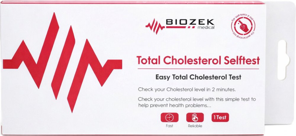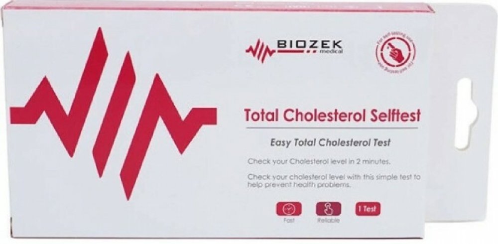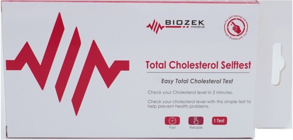 Biozek Total Cholesterol Selftest je spolehlivý domácí test na měření celkového cholesterolu v krvi, určený pro snadné použití bez nutnosti návštěvy lékaře nebo laboratoře. Test se provádí z kapilární krve z konečku prstu a výsledek je znám do 3 minut.