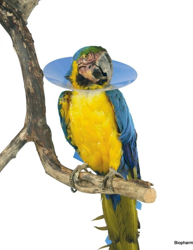 Jednorázový průhledný obojek pro ptáky zabraňující zvířeti škubání peří a ran.
