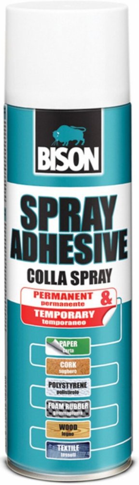 Lepidlo ve spreji Bison SPRAY ADHESIVE je lepidlo na bázi SBR kaučuku určené k lepení větších ploch celé řady materiálů. Určeno pro silné, rychlé a pevné plošné lepení. Slepí například papír, lepenku, dřevo, textil, kůži, kov, plsť, pěnový polystyren (styropor) a jiné pěnové hmoty, četné umělé hmoty se stejným i jiným materiálem. Lepidlo je odolné teplotám od -40 °C do +50 °C.