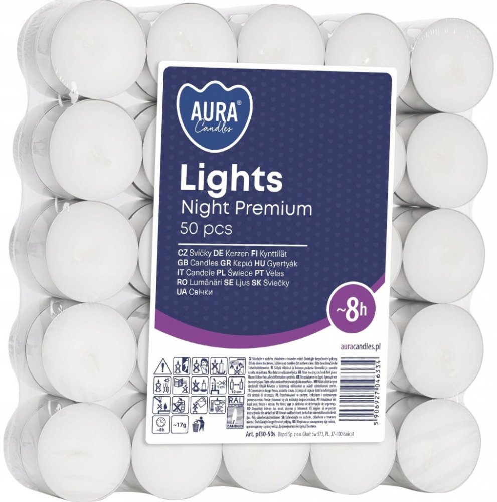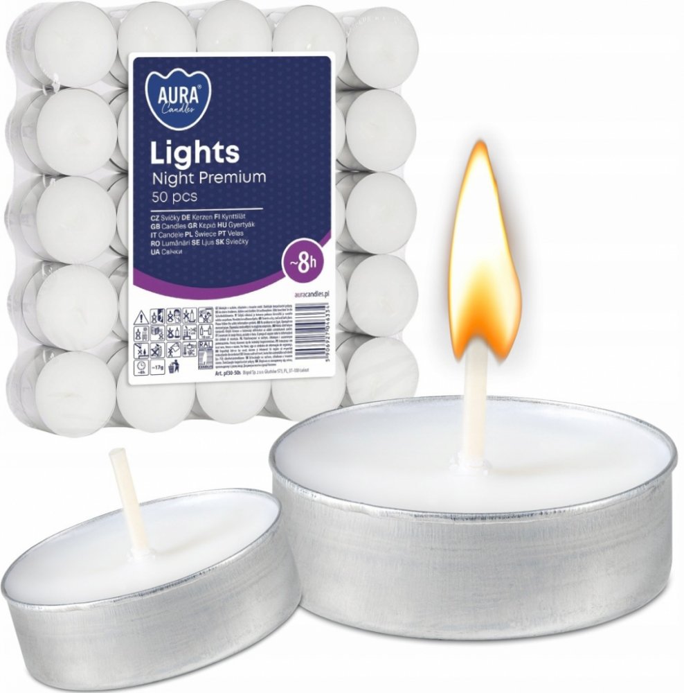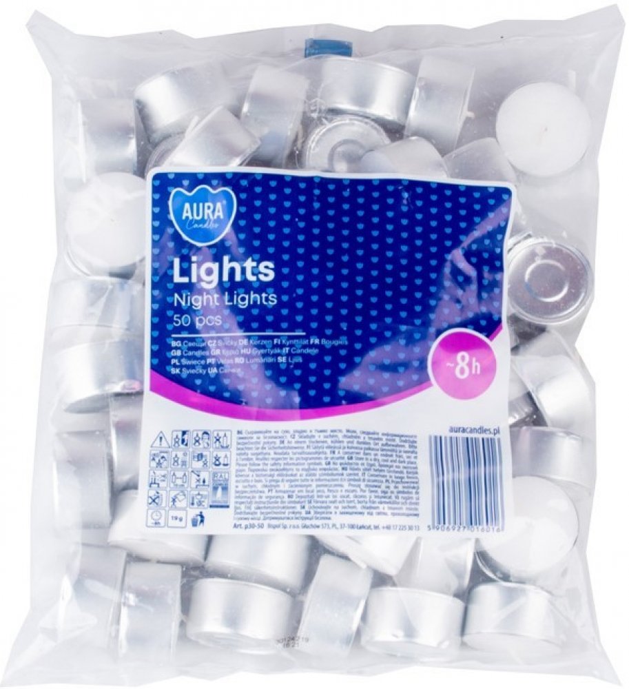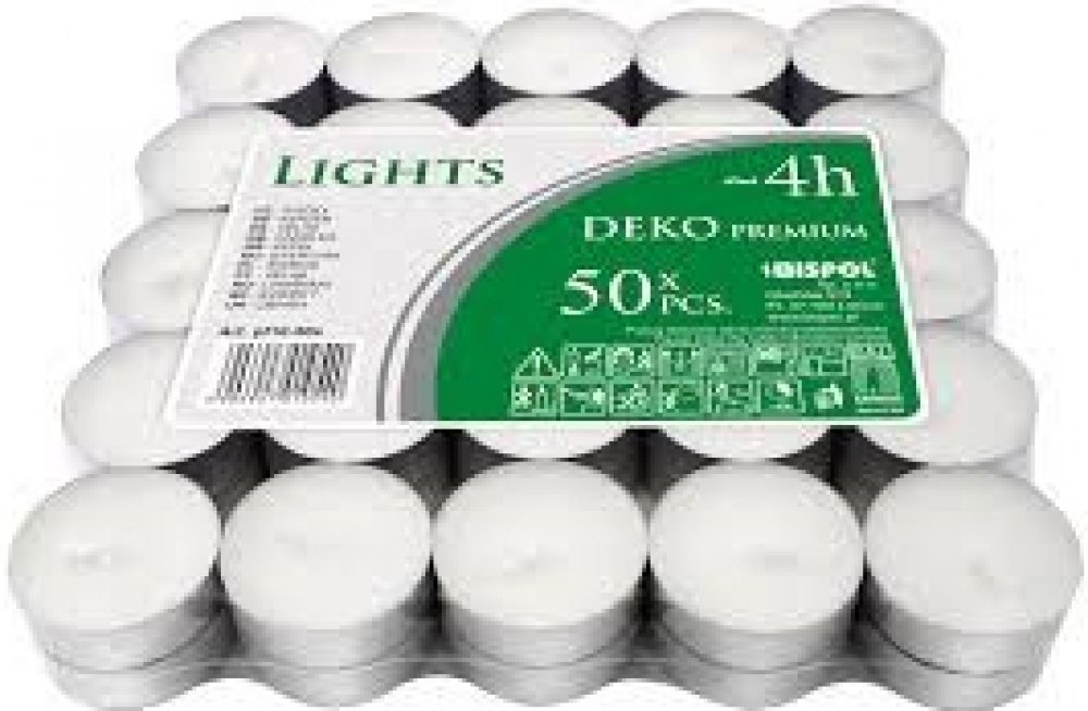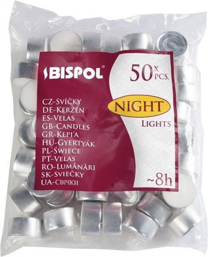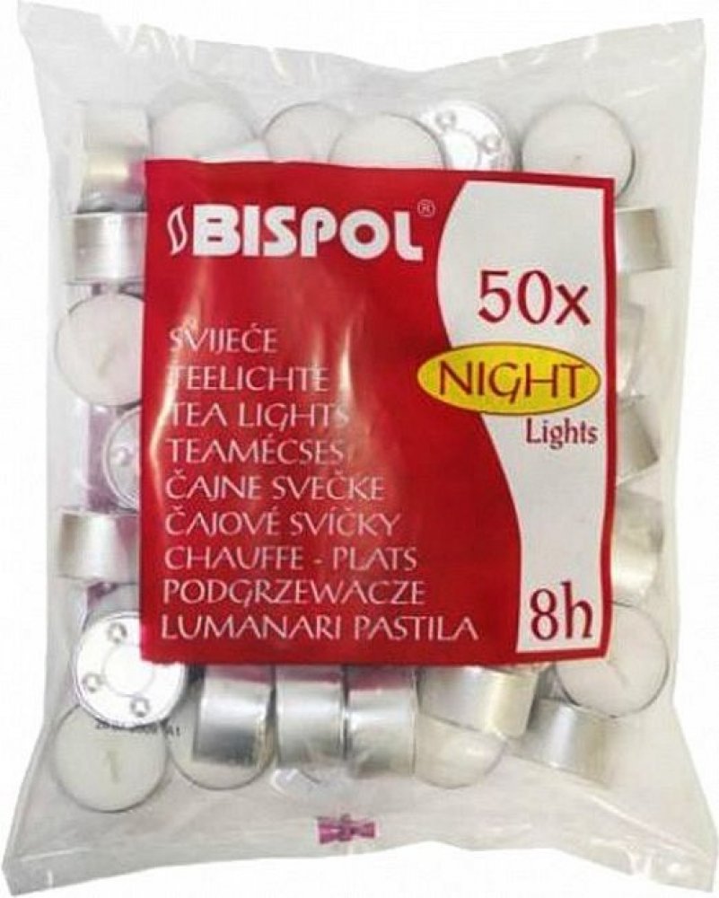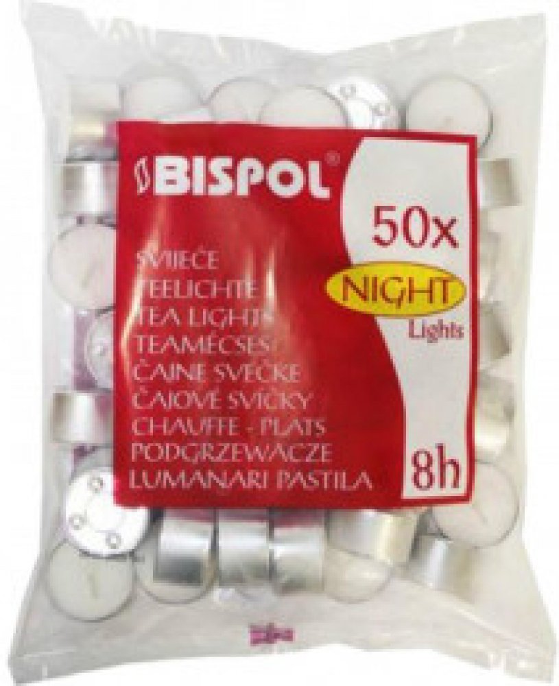Čajové svíčky Bispol Night Lights jsou skvělým prvkem interiérového designu. Jejich teplý plamen prozáří každou místnost a vytvoří romantickou auru. Čajové svíčky jsou ale vhodné také do do aromalamp, dekorativních svícnů, solných lamp ale i pro ohřev fondue. Jedna svíčka hoří přibližně 8 hodin. Ekonomické balení obsahuje 50 kusů svíček, v klasickém bílém barevném provedení. Bez parfemace.