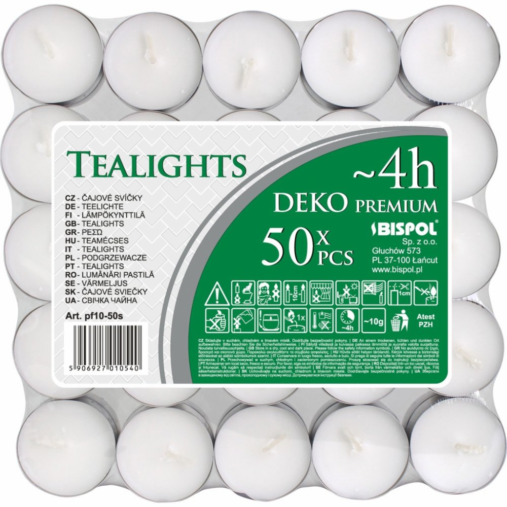 BISPOL Čajové svíčky DEKO PREMIUM bílé 10 g, 50 ks