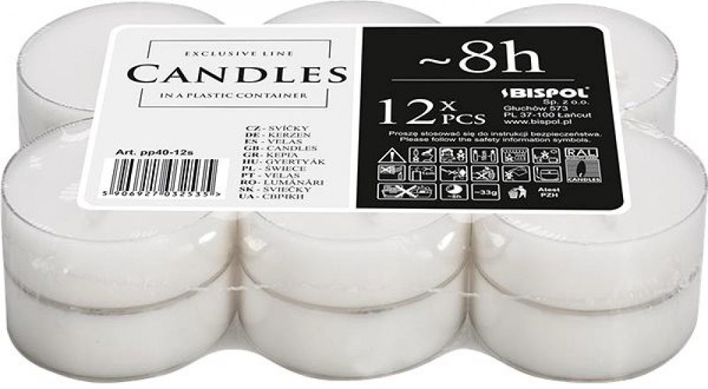 Malé svíčky ve skle BISPOL vás okouzlí, pokud dáte na svíčky bez vůně. BISPOL čajové svíčky maxi 12 ks hoří po dobu 8 h. Zásadní přednosti svíčky BISPOL čajové svíčky maxi 12 ks Neparfémovaná svíčka Kategorie: svíčky ve skle Celková hmotnost je 330 g Svíčka BISPOL zvládne hořet po dobu 8 h