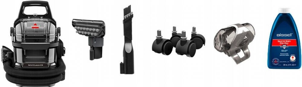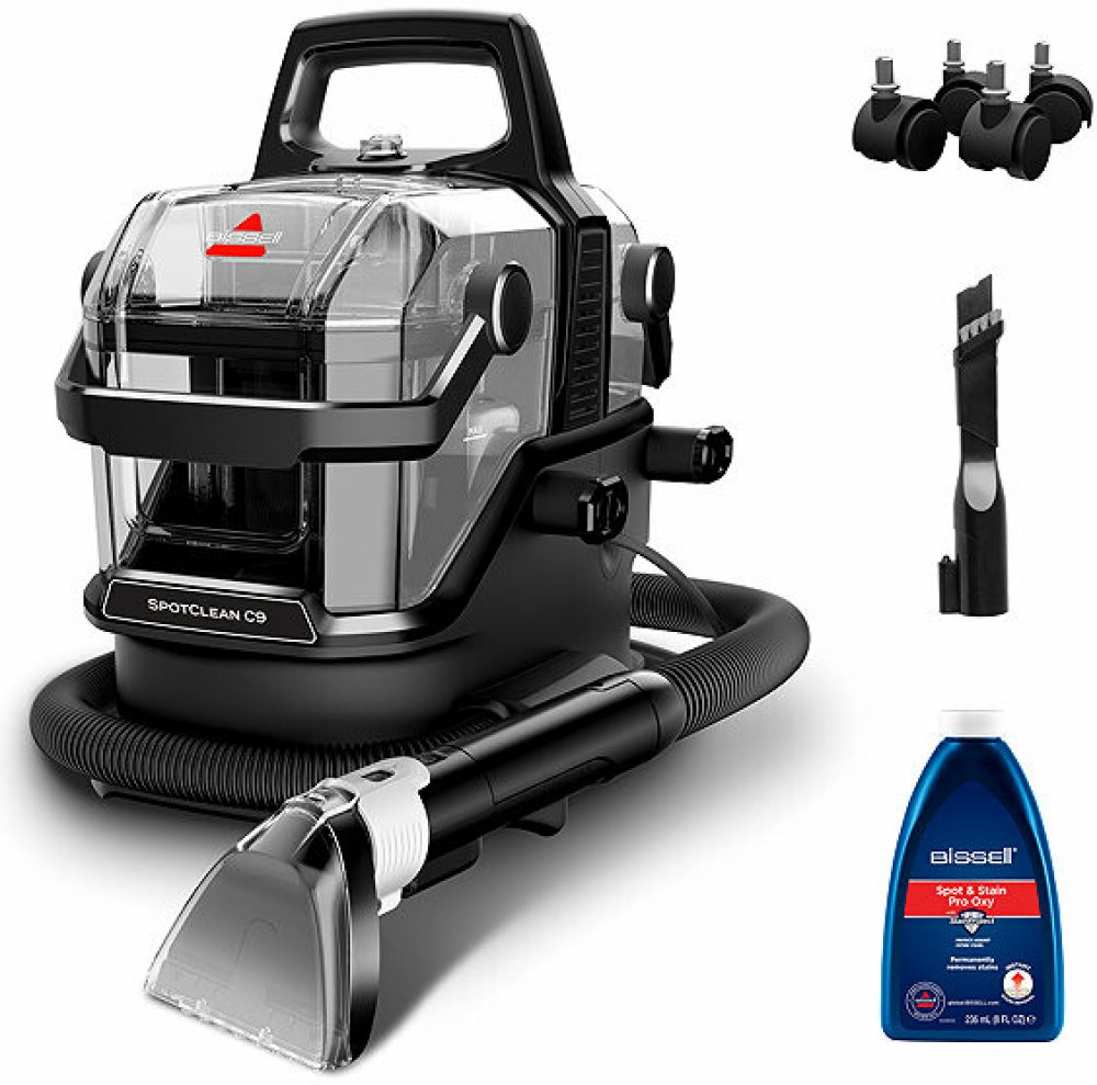 Bissell SpotClean C9 Pro. Typ stroje: Ruční, Čištění povrchů: Automobilový interiér, Koberec, Schody, Čalounění, Objem nádoby na čistou vodu: 1,7 l. Barva výrobku: Černá, Délka kabelu: 4,6 m, Délka kabelu: 1,5 m. Šířka výrobku: 320 mm, Hloubka výrobku: 390 mm, Výška výrobku: 368 mm. Obsah balení: 10 cm dlouhý kartáčový kartáč s funkcí self-cleaning pro stubborn stains, casters, 236 ml...