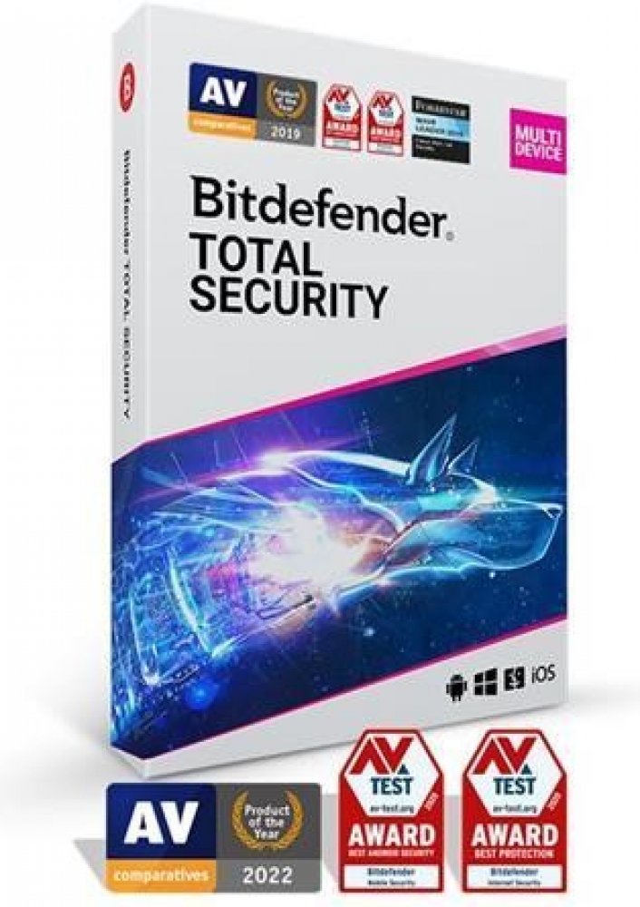 Antivirová ochrana Bitdefender Total Security je určena pro zařízení se systémy Windows, macOS, Android i iOS. Chrání proti virům a ransomwaru, ochraňuje soukromí na veřejné Wi-Fi síti, zabezpečuje placení online, pomáhá optimalizovat výkon počítače či mobilu, chrání také před phishingem a podvodnými útoky, ochraňuje webkameru a mikrofon. Podporované systémy jsou Windows 7 SP 1 a novější, macOS X Yosemite (10.10) a novější, iOS 11.2 a novější, Android 4.1 a novější. Elektronická licence online. 10 licencí na 12 měsíců.
