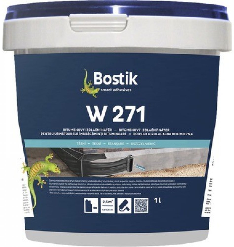 Bitumenový izolační nátěr Bostik W 271, 1 l. Bostik W 271 je černý krycí nátěr na latex-bitumenové bázi, bez obsahu rozpouštědel, který odpuzuje vodu. Jedná se o ochranný nátěr pro venkovní použití na betonových plochách a zdivu s plně promaltovanými spárami v oblastech, které přicházejí do styku s půdou, jako izolace proti zemní vlhkosti. Nátěr zaschne do bezešvého, fóliového povlaku. Nezkřehne a je odolný vůči běžně se vyskytujícím betonu agresivním látkám.