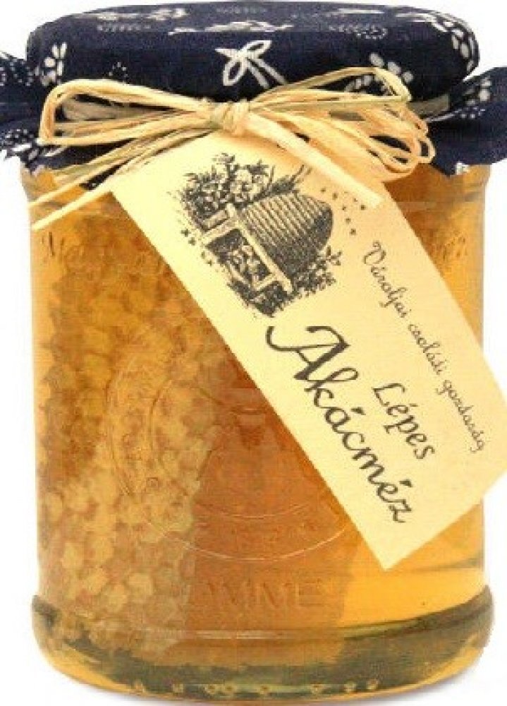 Kvalitní akátový včelí med s výřezem medového plástu umístěný v láhvi. Čistě přírodní včelí med bez jakékoliv úpravy a bez jakýchkoli umělých přísad.