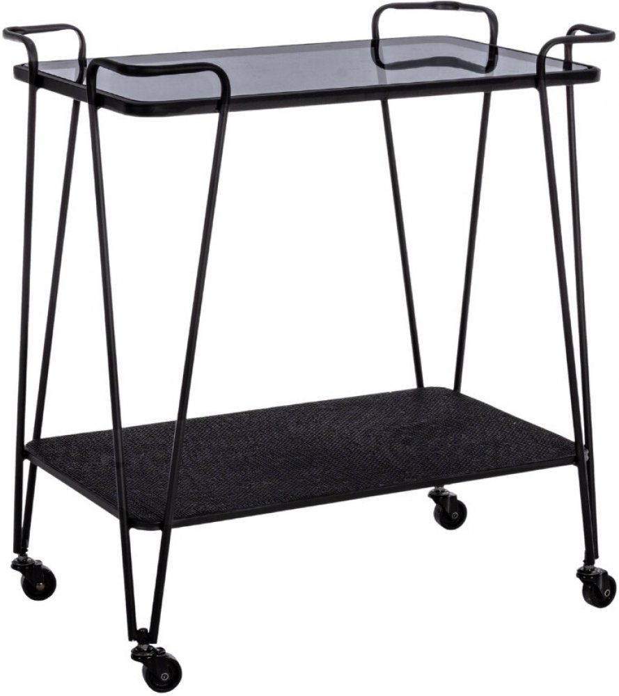 Praktický servírovací vozík Bizzotto Zahira vyniká svým moderním a elegantním designem. Horní deska pro umístění vín, likérů či jiných nápojů je z černého tvrzeného skla a spodní z kovu. Černý kovový rám vozíku zaručuje stabilitu a kolečka možnost popojíždění, například pro pohodlné servírování hostům.