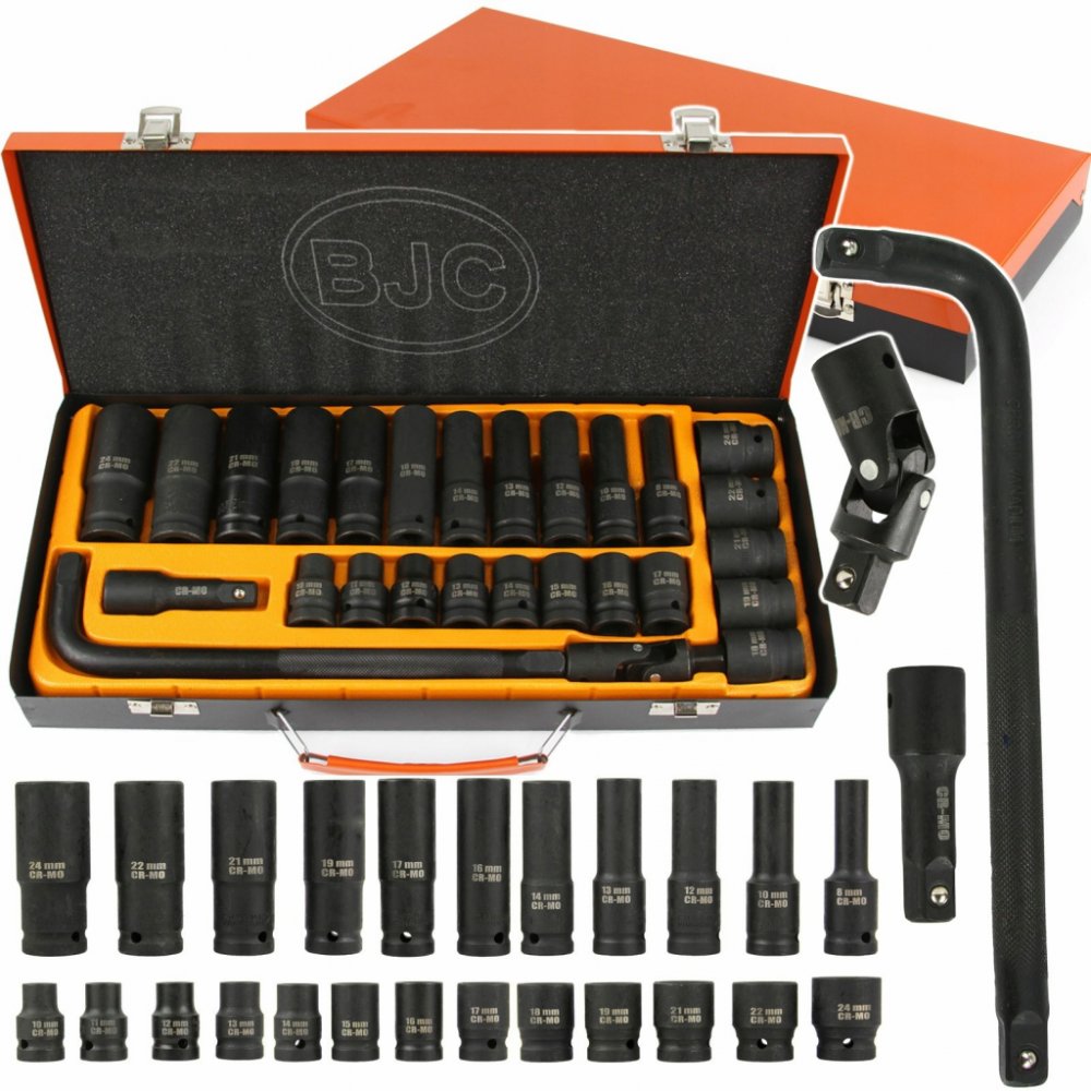 Univerzální 27dílná sada 1/2″ hlavic BJC z kvalitní oceli, vhodná pro autoservisy, dílny i domácí kutily. Obsahuje krátké a dlouhé hlavice, nástavce, kloub a praktický kufr.