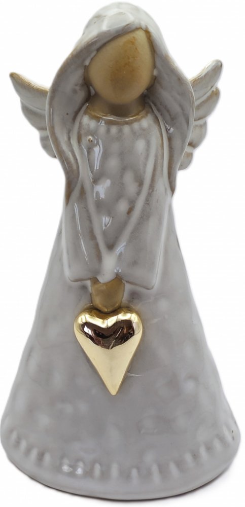 Tento nádherný keramický anděl je dokonalým spojením elegance a jemnosti, který zútulní váš domov nebo poslouží jako originální dárek. S rozměry 9 x 9 x 16 cm je ideálním dekorativním prvkem pro váš interiér, který zaujme svými odstíny bílé a platinové. Ručně vyráběný anděl drží v rukou zlaté srdce, což mu dodává nádech jedinečnosti a symboliky lásky a klidu. Jeho drobná křídla dokonale doplňují celkový design a vytvářejí harmonický vzhled. Tento anděl je více než jen dekorace – je to posel míru a krásy, který v sobě spojuje precizní ruční práci a nadčasový styl.