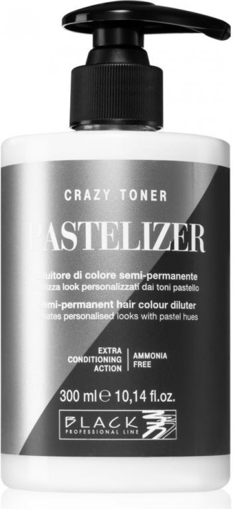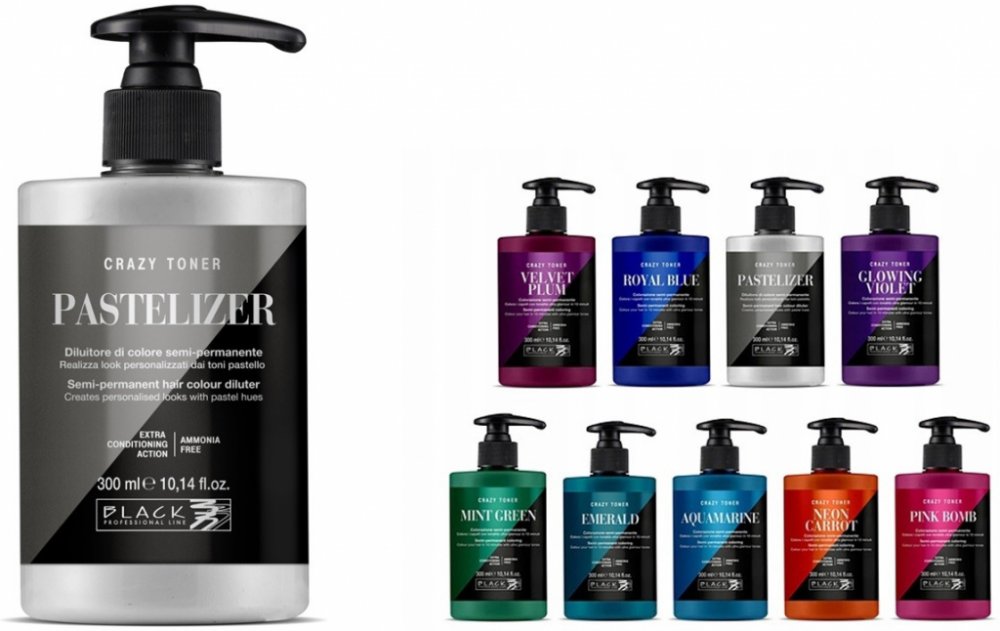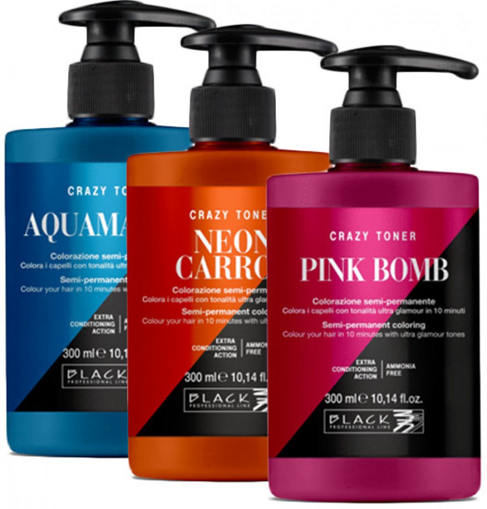 Řekněte stop nudě a vyzkoušejte nápadité a stylové semi-permanentní barvy, které dočasně promění váš vzhled a dodají vašim vlasům hravé a nekonvenční barevné tóny. Semi-permanentní barva na vlasy Black Professional Crazy Toner Semi-permanent Hair Colour je barvící toner na bázi masky, která poskytuje mimořádně intenzivní odstíny a vydrží na vlasech až 10 umytí. Šetrné složení bez obsahu amoniaku využívá syté barevné pigmenty, které vytvářejí moderní tónování bez použití oxidantů, rozjasní barvené i přírodní vlasy a zanechává vlasy sametově hebké, lehké a zářivě lesklé. Zároveň tento barvící systém dodává vlasům hloubkovou péči a hydrataci. Jemná textura barvy se podobá masce, která snadno přilne k vlasovému vláknu a praktické balení s pumpičkou umožňuje lehkou a rychlou aplikaci. Semi-permanentní barvy Black Professional Crazy Toner Semi-permanent Hair Colour nabízí 8 intenzivních, barevných odstínů, které jsou vzájemně míchatelné a umožňují tak vytvořit jedinečný moderní odstín. Barevný odstín se po častém mytí vlasů změní na pastelový, až se úplně vymyje. Úplné vymytí barvy z vlasů potrvá až 10 umytí. Nejlepší výsledky jsou viditelné na přírodních světlých vlasech, předem odbarvených nebo melírovaných. Čím světlejší bude vaše barva vlasů, tím intenzivnější bude výsledek.