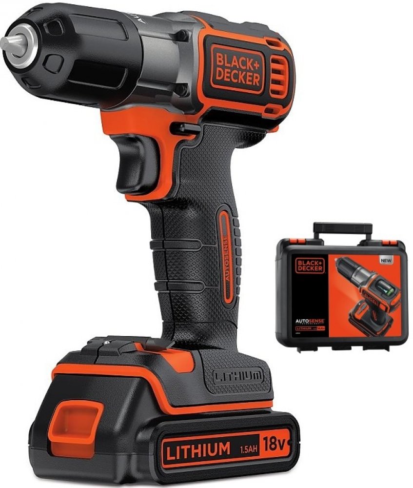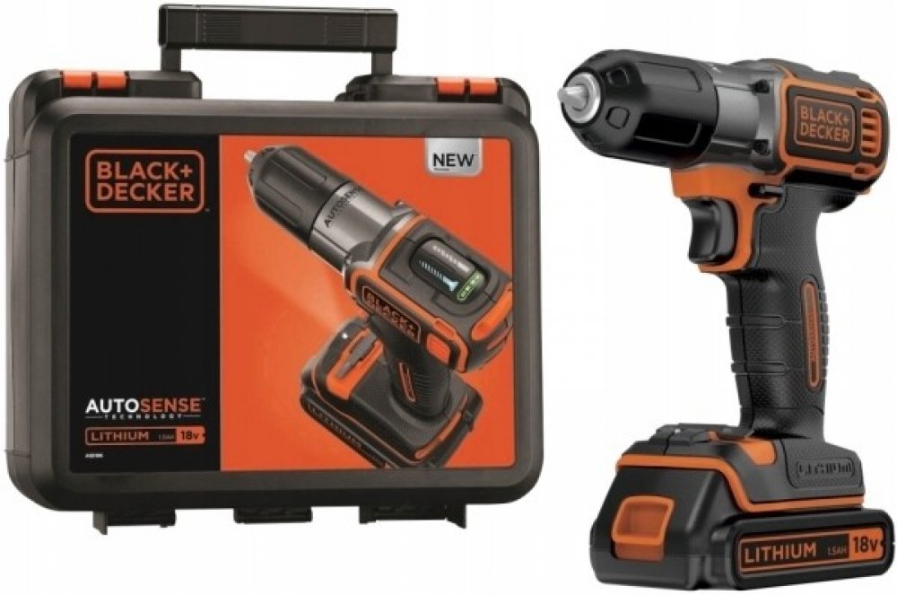 Aku vrtačka 18V 1,5Ah Black a amp;Decker ASD18K s technologií Autosense ™ a technologie Autoselect(R) vhodný pro vrtání do dřeva, kovu a šroubování.