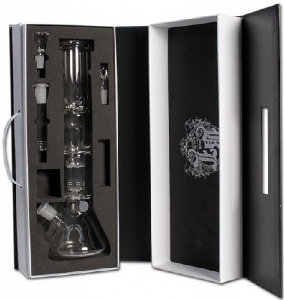 Měkce uložený v pěnové gumě - toto skleněné bong Black Leaf® v baňkovém designu s ledem, vhodné k uzení bylinek a oleje, je dodáváno v černobílé krabičce o rozměrech 430x170x132mm a je ideální jako dárek nebo na cesty. Je vybavena 6ramenným překapávačem stromů s ochranou proti stříkající vodě, bočním výkopem s pryžovou zátkou, adaptérem se štěrbinami difuzoru, miskou na bylinky s SG 14,5 mm s roll...