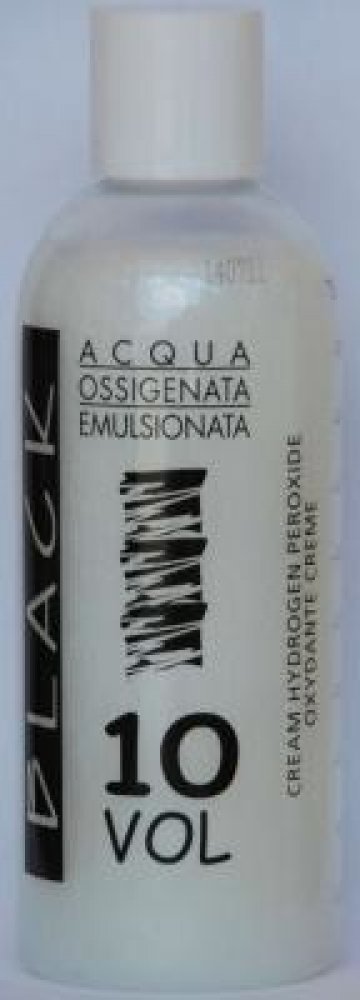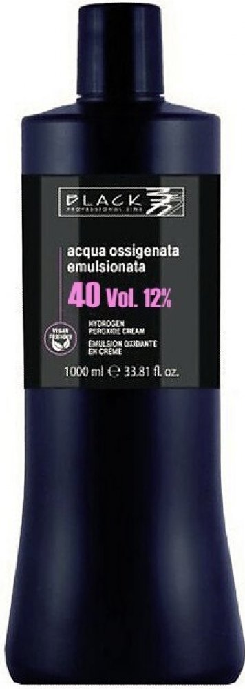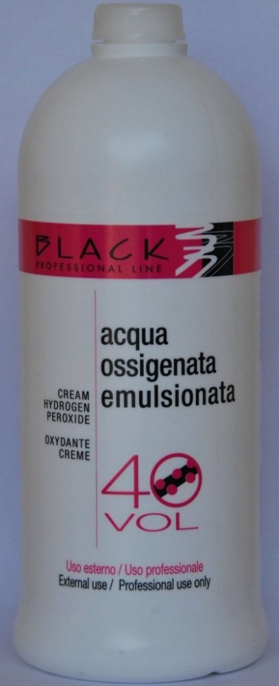 BLACK Professional krémový peroxid vodíku 40 VOL (12%) - krytí a současné zesvětlení o 3 - 6 odstíny. Peroxid vodíku Black se dodává v emulzi, jejíž výhodou je hutnější konzistence vzhledem k běžnému tekutému peroxidu vodíku. Krémová konzistence tohoto výrobku zaručuje snazší použití, zabraňuje problémům se stékáním a je k vlasům šetrnější.