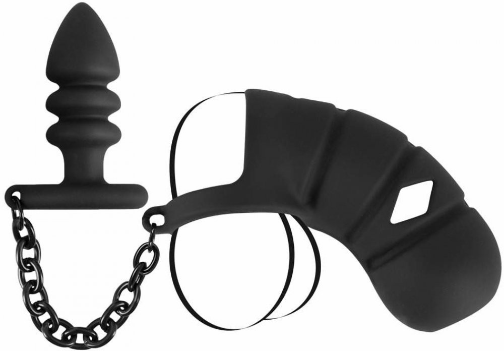 - Klec na penis, kroužek na varlata a anální kolík v jednom