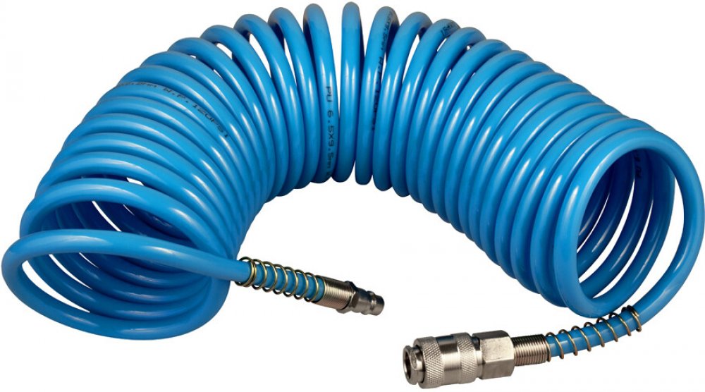 - spirálová hadice z polyuretanu PU určená pro připojení pistolové techniky a pneumatického nářadí ke kompresorům a zdrojům stlačeného vzduchu