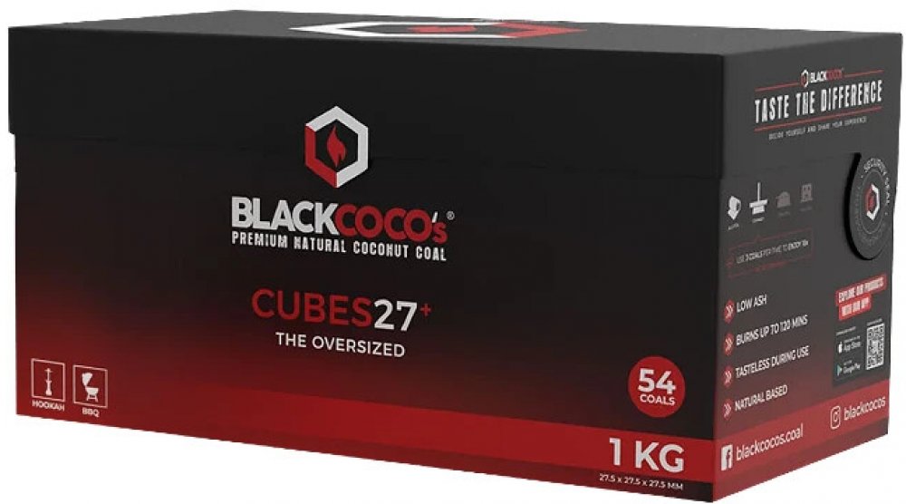 BLACKCOCO´s jsou jedny z nejznámějších kokosových uhlíků, ve verzi C27 jde o velmi velké kostky o hraně délky 27 mm.Balení obsahuje 54 ks extra velkých uhlíků pro vodní dýmky, které mají mimořádnou výhřevnost a vydrží hořet velmi dlouho.V balení kokosových briket není žádná uhelná drť a uhlíky jsou velmi pevné. Výhřevnost je mnohem vyšší než u dosavadních grilovacích uhlík...
