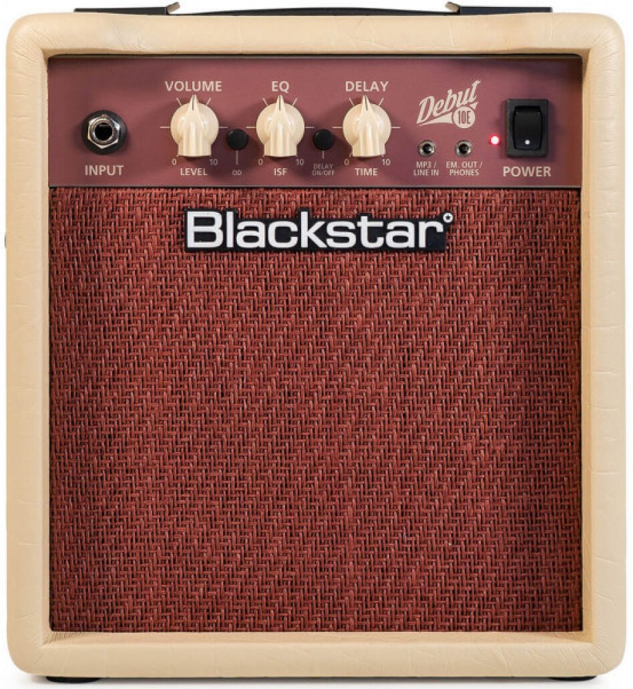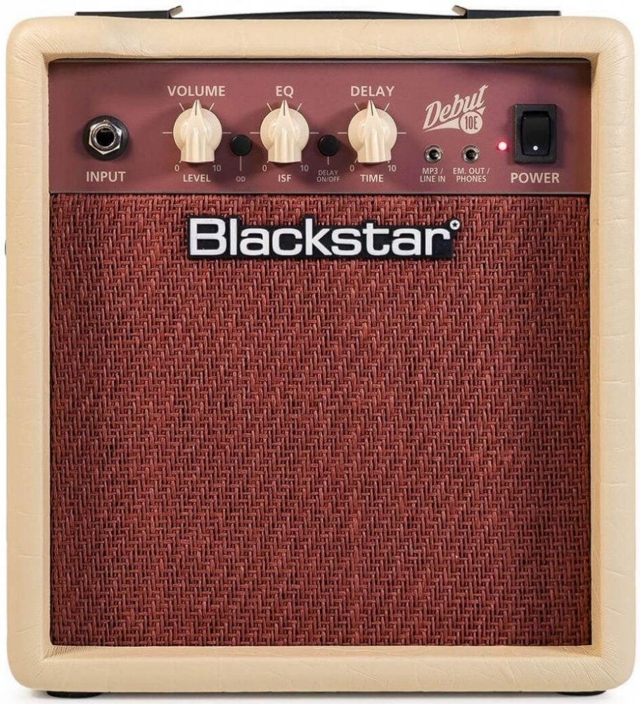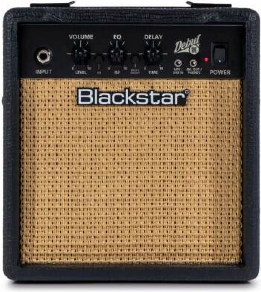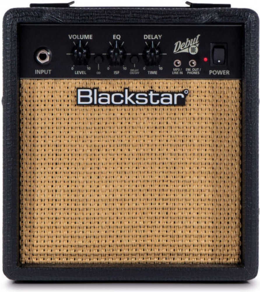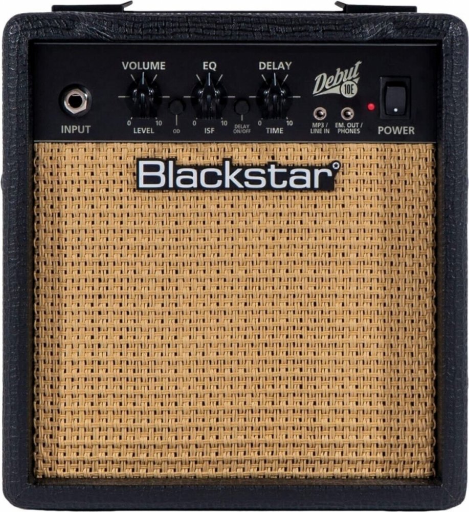 Debut 10E je tranzistorové kytarové kombo od výrobce Blackstar. Disponuje zesilovačem o výkonu 10W. Přepínat lze mezi dvěma kanály (Clean a Overdrive). Patentovaný ekvalizér ISF (Infinite Shape Feature) umožňuje plynule přecházet mezi zvukem amerických (hutné basy a agresivní středy) či britských (dřevitější a méně agresivní) zesilovačů. Ozvláštnit zvuk dovoluje integrovaný efekt Delay s charakterem páskového echa. Aparát si oblíbí kytaroví začátečníci a muzikanti, kteří hledají cenově dostupné kombo na domácí cvičení nebo nahrávání v domácích podmínkách. VlastnostiDvoukanálové kombo je osazené dvěma 3" reproduktory. Ovládání komba sestává z ovladačů hlasitosti (Volume), ekvalizéru (ISF EQ) a Delaye (Time). Sluchátkový výstup s emulací reproboxu se nabízí k využití při domácím cvičení a nahrávání. Linkový vstup slouží pro připojení externího zvukového zdroje (CD / mp3 přehrávač, chytrý telefon). Hráč tak může cvičit zároveň se svými oblíbenými skladbami. Kabinet potažený černou koženkou chrání mřížka v “piškotovém” odstínu. O řaděŘada tranzistorových komb Debut rozšiřuje bohaté portfolio aparátů od britské ambiciózní značky Blackstar. Uplatní se zejména při domácím cvičení či nahrávání v jednoduchých domácích podmínkách. Komba se svým jednoduchým účelným ovládáním představují ideální první aparáty pro začínající hudebníky. Díky dvojici stereo lineárních reproduktorů podobných těm, které se nachází v HiFi systémech, lze kombíčka využívat také pro ozvučení při sledování filmů nebo při hraní PC her. Vybírat lze z několika barevných variant a modelů o výkonu 10W, 15W nebo 50W. Specifikace• Tranzistorové kytarové kombo