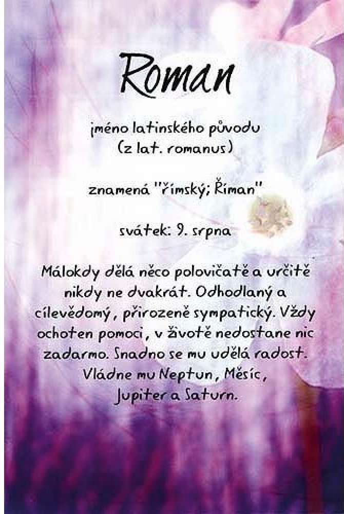 Blahopřání na přední straně obsahuje jedinečné informace týkající se původu a výzmamu jména, datum oslavy svátku včetně stručné charakteristiky osoby, která se pyšní jménem uvedeném na blahopřání. Vhodné jako výjimečné a originální přání či jako součást dárku.Prodej pouze po celém balení.Balení: 3 ks.