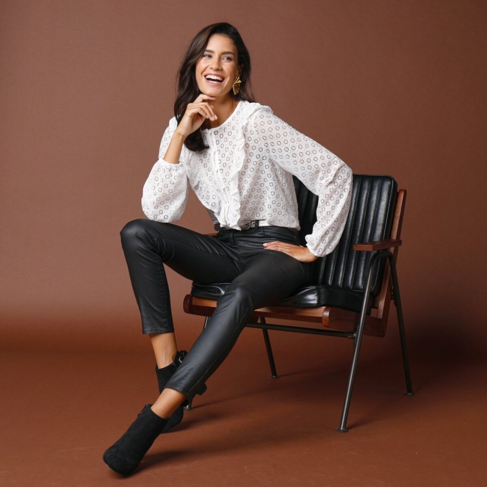 Rafinovaná a romantická, je tu módní halenka s knoflíčky a krajkovými volány. Skvělá pro boho styl i klasické kombinace, stačí si jen vybrat. Krajka s květinovým vzorem. Kulatý výstřih. Na hrudníku knoflíčková léga s očky. Náprsenka do "V" pod výstřihem lemovaným volánky. Vzadu ve výstřihu volány. Dlouhé rukávy a pružné manžety. Rovný spodní lem. Lze prát v pračce.