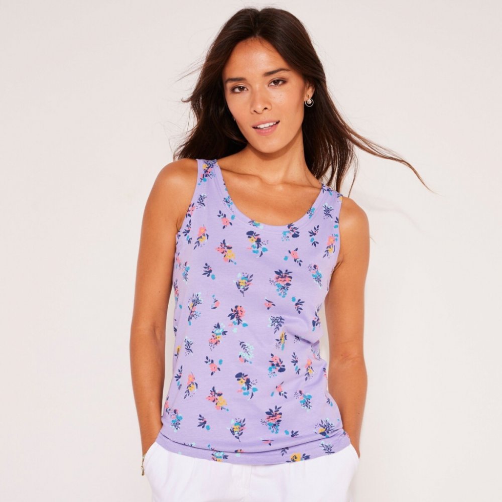 Pohodlný a ženský top se širokými ramínky je plný barev. Kulatý uvolněný výstřih. Široká ramínka. Nadčasový potisk květin. Bavlněný rychleschnoucí žerzej. Standard 100 podle Oeko-Tex (n° CQ 1216 / 3 IFTH). Tato známka označuje textilní výrobky, které byly podrobeny laboratorním testům na široké spektrum škodlivých látek a výrobek je bezpečný nad rámec platných norem. Lze prát v pračce.