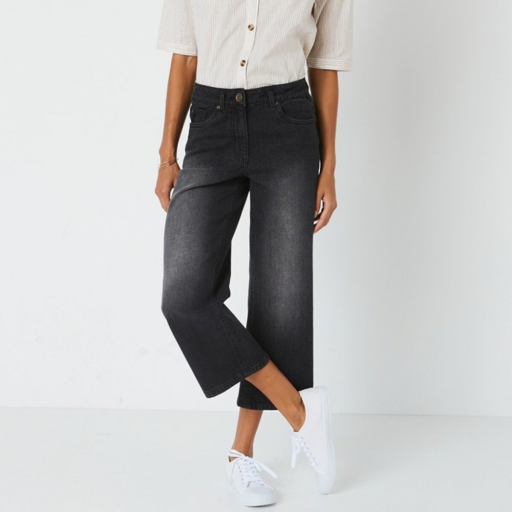 Široký zkrácený střih speciálně navržený pro ženy s výškou 160 cm a méně nemá chybu! Široký pohodlný střih. Zkrácená délka. 5 kapes s kovovými nýtky. Běžná výška pasu. Vsazený tvarovaný pas s 5 poutky. Vzadu zvýšený díl. Zapínání na zip + 1 knoflík. Strečový pohodlný denim. Standard 100 podle Oeko-Tex (n° CQ 1216 / 3). Tato známka označuje textilní výrobky, které byly podrobeny laboratorním testům...