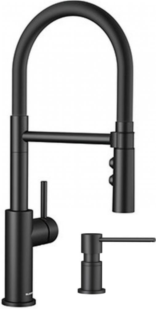 1. Stojánková kuchyňská baterie Blanco Catris-S černá 525793 - výška baterie: 48 cm- vysoký tlak- vytahovací výtok- úhel otáčení výtoku 360°- požadovaný průměr otvoru pro baterii 35 mm- s voličem proudu, koncentrovaným nebo sprchovým proudem- horní sprcha s keramickým těsněním- plastová výtoková trubice- flexibilní připojovací hadice o délce 45 cm s maticí 3/8''- regulátor proudu snižuje usazování vodního kamene na hlavě baterie- výztužná deska zajišťuje větší stabilitu baterií instalovaných v ocelových dřezech- standardně vybavena zpětnou klapkou proti zpětnému toku v souladu s normou EN 1717- barva: matná černá 2. Blanco Lato dávkovač tekutin 300 ml na desku černý matný 525789 - kapacita: 300 ml- potřebný otvor o průměru 35 mm- barva: černá matná