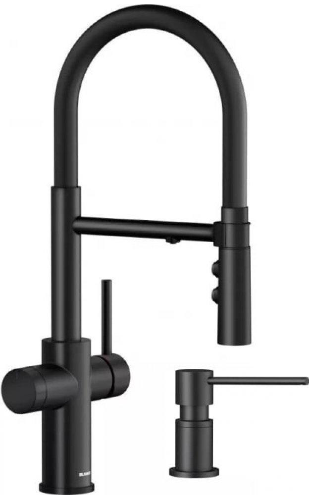 1. Stojánková kuchyňská baterie Blanco Catris-S černá 526707 - typ: baterie - přepínání proudu vody: ano - výsuvný postřik: ano - typ výrobku: jednopákový - úhel otáčení: 360 - výška: 48 cm - výška vypouštění vody: 15,7 cm - dosah výtoku: 28,3 cm - instalační otvor: průměr 3,5 cm - připojení k filtru: ano - úhel otáčení výtoku 360° - požadovaný průměr otvoru pro kohoutek 3,5 cm - nad hlavou s keramickými deskami - plastová výtoková trubice - černá silikonová výtoková hadice - 70 cm dlouhé flexibilní připojovací hadice s ⅜" maticí pro filtrovanou vodu a ½" maticí pro studenou/horkou vodu z vodovodní sítě - patentovaný regulátor proudu výrazně omezuje usazování vodního kamene na hlavě baterie - stabilizační deska zvyšuje stabilitu baterie při montáži na ocelové dřezy - vybavena zpětným ventilem pro zabránění zpětnému toku v souladu s normou EN 1717 - bez filtračního systému - povrchová úprava: Silgranit-Look - barva: matná černá 2. Dávkovač tekutin Blanco Summer 300 ml na desku černý matný 525789 - kapacita: 300 ml- požadovaný průměr otvoru 35 mm- barva: matná černá