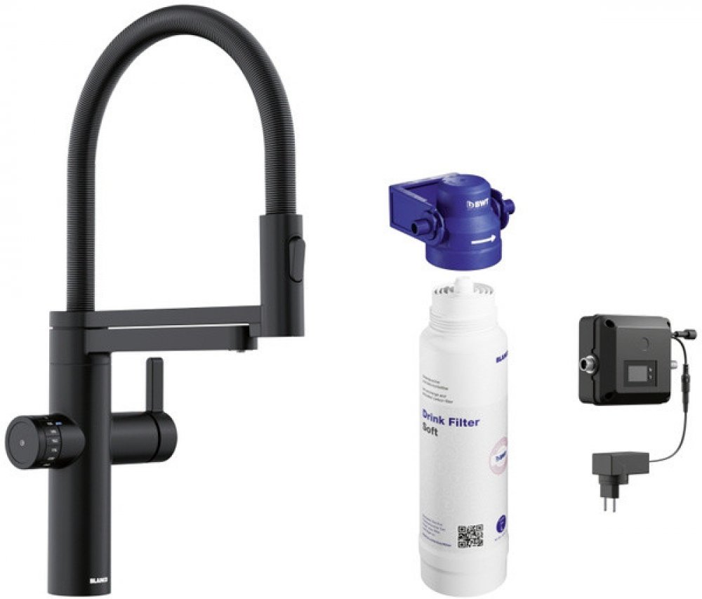 Stojánková dřezová baterie s možností připojení na užitkovou i filtrovanou vodu - má dvě páčky a dva perlátory, provedení Černá matná (nástřik), výška 447 mm, přepínací sprcha na pružině, pro otvor 35 mm, otočná o 360 °.Součástí baterie je kompletní filtrační systém BWT včetně filtru. Samozřejmostí je příslušenství k montáži. Není třeba nic dokupovat.