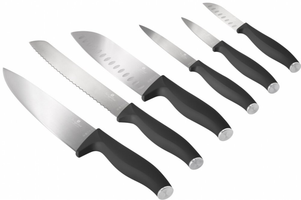Velice kvalitní nerezová ocel, tepelná úprava, měkká rukojeť. Souprava obsahuje: kuchařský nůž 20cm, nůž na pečivo 20cm, nůž Santoku 17.5cm, univerzální nůž 12.5cm, loupací nůž 9cm, nůž Santoku 9cm