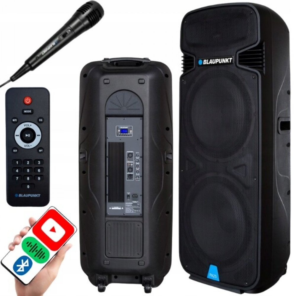 Blaupunkt PA25 - Profesionální Audio Systém je produkt speciálně navržený tak, aby splňoval potřeby těch nejnáročnějších uživatelů, kteří oceňují vysokou kvalitu zvuku kamkoli jdou. Byl navržen a modelován na základě profesionálních zvukových systémů. Pevná konstrukce, velmi výkonný zesilovač a vysoce kvalitní komponenty (se dvěma 38 cm basovými reproduktory!) Jsou jen některé funkce, které budou ideální pro vaše podnikání, tělocvičnu nebo pro jakoukoli činnost, kterou si užíváte při poslechu hudby. Celkový hudební výkon PA25 je přibližně 1900 Watt, což ve spojení se správnou konfigurací zaručuje nekompromisní zvukový zážitek.