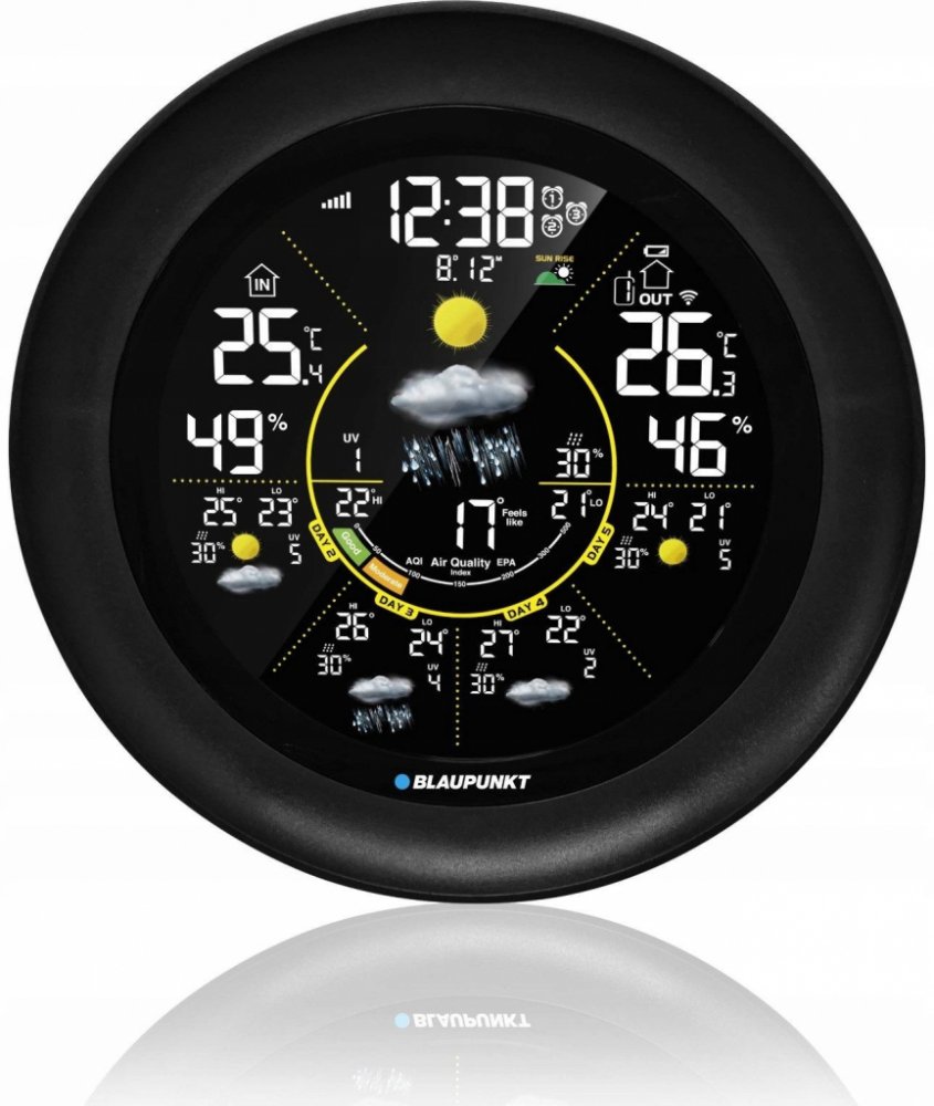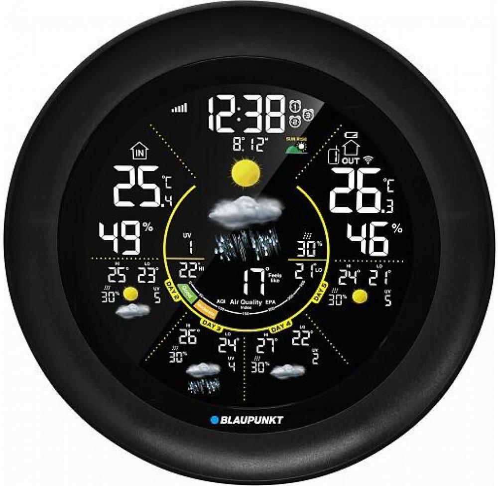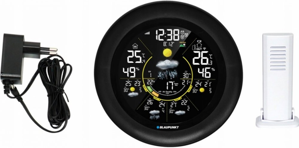 Blaupunkt WS65BK APP je moderní meteorologická stanice, která kombinuje funkce monitorování povětrnostních podmínek s kontrolou kvality vzduchu. Zařízení se vyznačuje kulatým krytem v elegantní černé barvě a přehledným barevným LCD displejem.