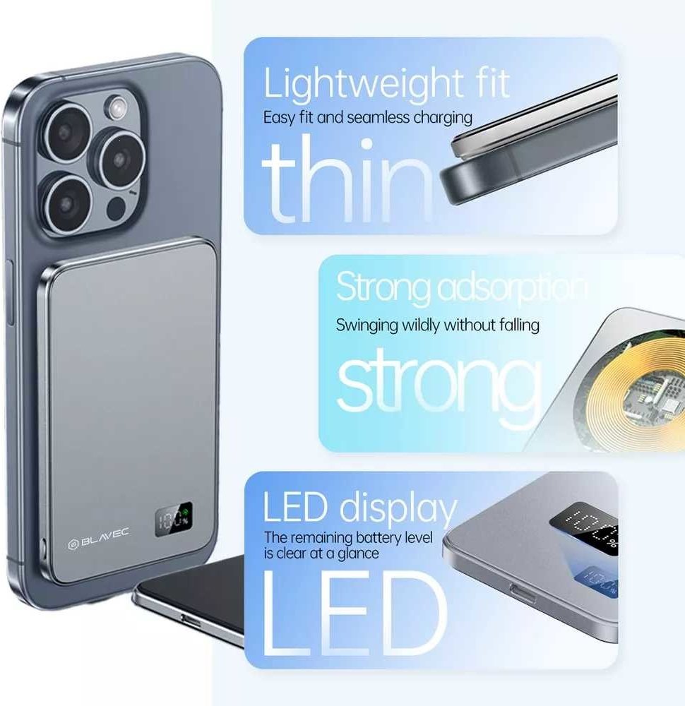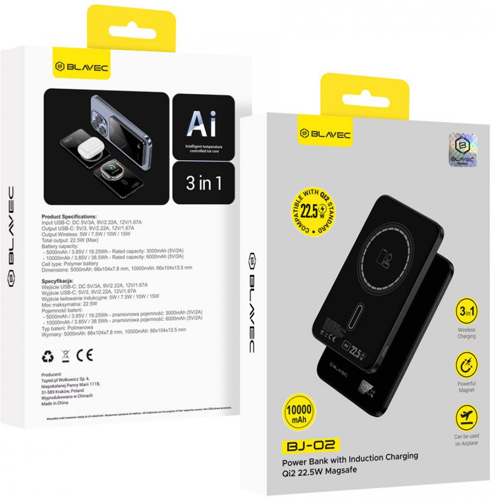 Blavec Power Bank 10000mAh BJ02 Slim 15mm - Typ C - 22,5W Magneticko-indukční MagSafe 3 v 1 (PBBJ02-MC10B) ČernáDvojnásobná kapacita, stejné pohodlíTloušťka pouhých 15 mm – Větší kapacita bez kompromisů v kompaktnosti. Magnetický držák – N52 MagSafe, silný úchop i při intenzivním pohybu.Výkon a bezpečnostAI NTC Ice Core – Inteligentní regulace teploty zajišťuje bezpečné používání bez přehřátí. MagSafe 3 v 1 – Nabíjejte svůj iPhone, AirPods a Apple Watch v jednom zařízení.Modernost a funkčnostLED displej – Intuitivní odečet hladiny energie na první pohled. 22,5W USB-C port – Rychlý přenos energie do i z powerbanky.Specifikace produktuCelková kapacita: 10000 mAh (3,85 V / 38,5 Wh)Jmenovitá kapacita: 6000 mAh (5 V / 2,4 A)Rozměry: 104 × 66 × 15 mmHmotnost: 180 gPort: USB-C (vstup/výstup)Bezdrátový výstup: 15 W / 10 W / 7,5 W / 5 WMateriál: Hliníková slitina + tvrzené sklo