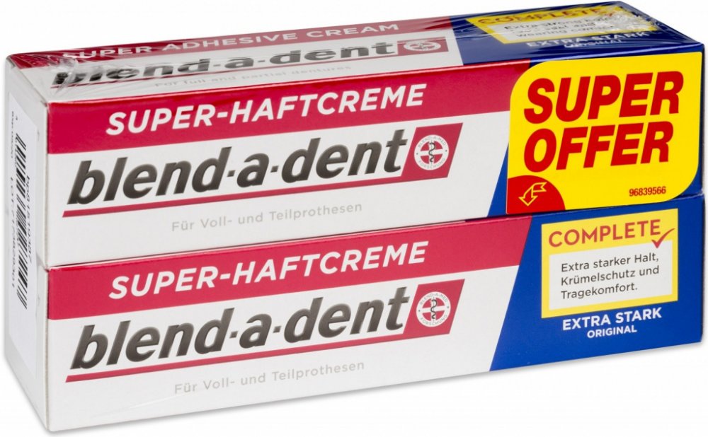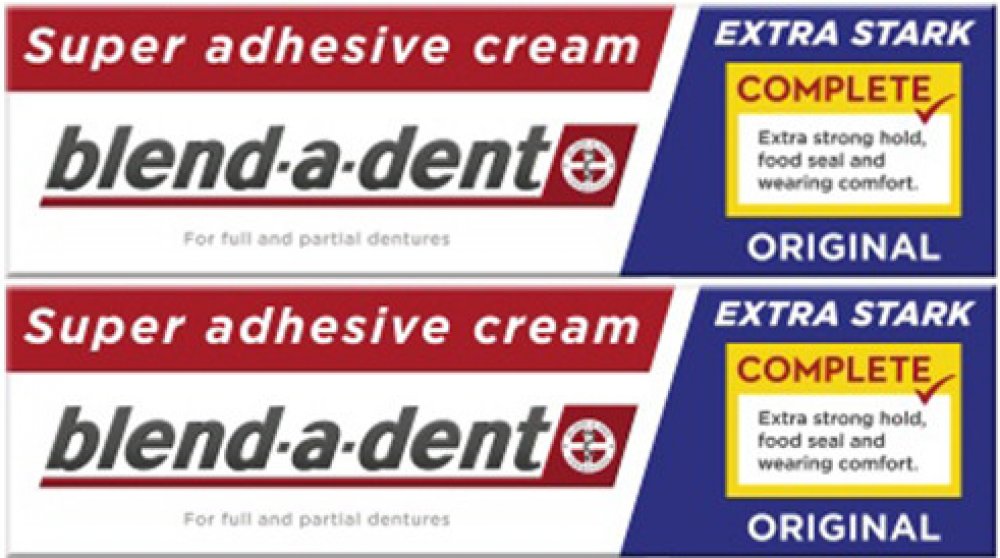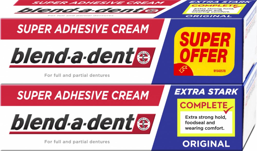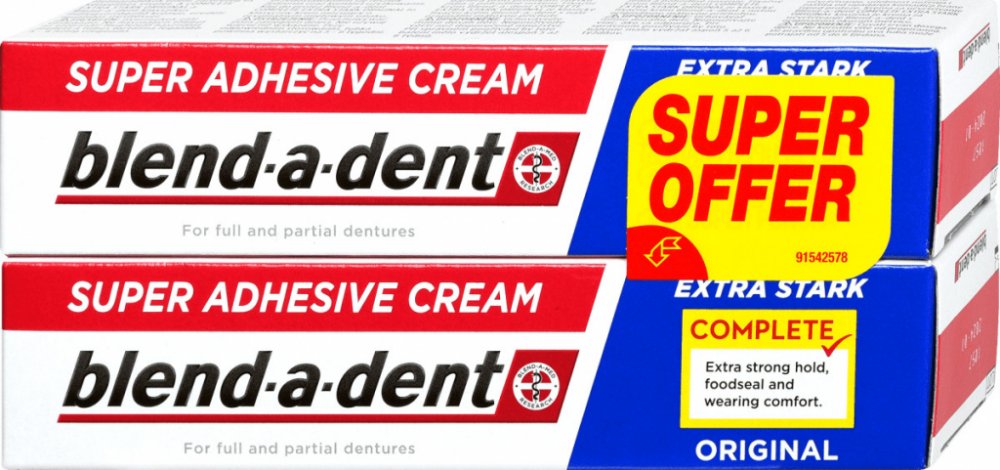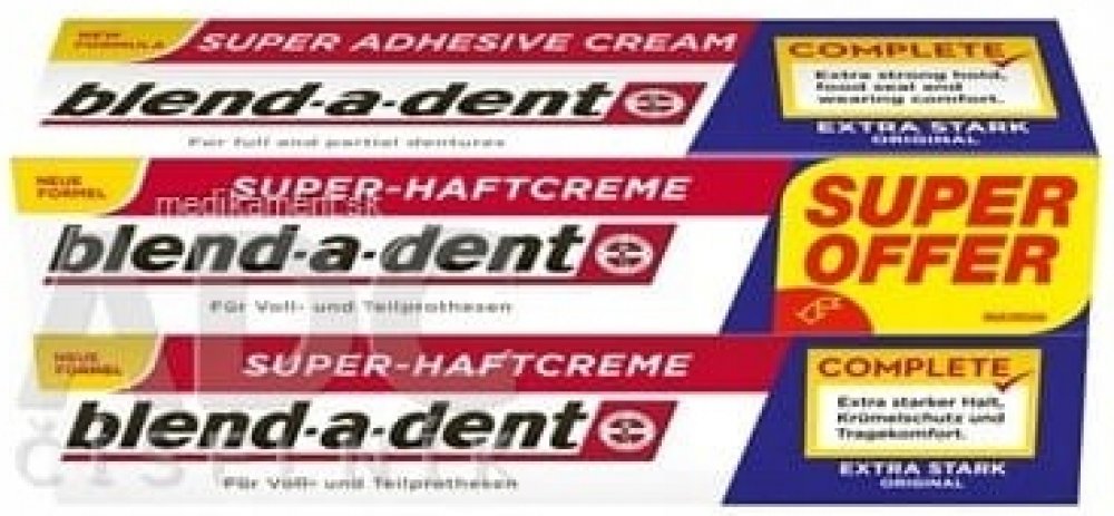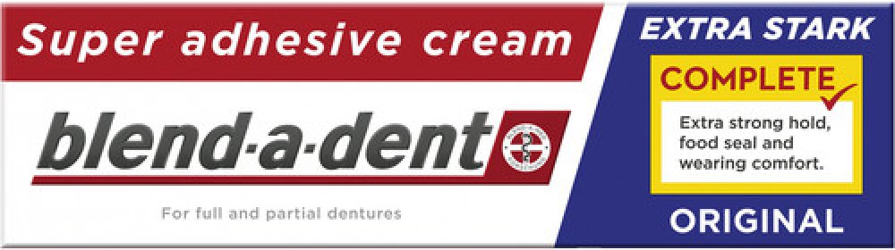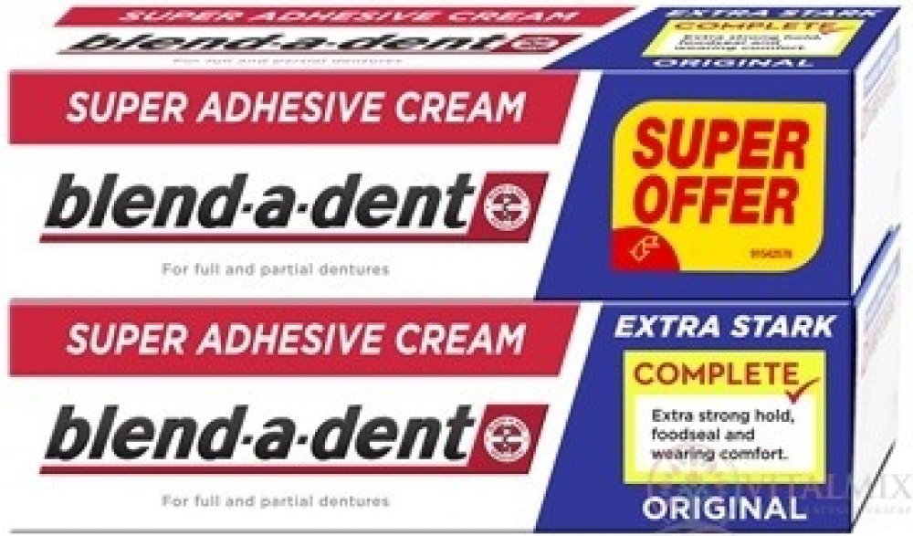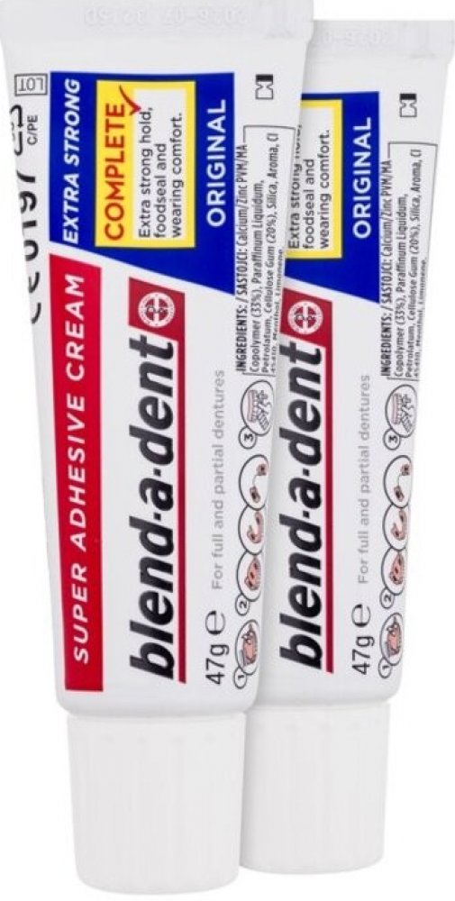 Blend-a-dent Complete Original - Fixační krém 2 x 47 g Blend-a-dent Complete Original - Fixační krém Blend-a-Dent upevňující krém Originál Complete je fixační krém bez chuti, který upevňuje zubní náhradu, posiluje sílu skusu a zabraňuje pronikání zbytků jídla pod zubní náhradu. Vytvoří vám pod zubní náhradou měkký podklad, který ochrání vaše dásně před mechanickým třením způsobeným zubní náhradou. Vlastnosti: - zvyšuje stabilitu zubní náhrady - posiluje sílu skusu až o 63 % (klinicky ověřeno) - abraňuje pronikání zbytků jídla pod zubní náhradu - chrání dásně před mechanickým třením způsobeným zubní náhradou Po aplikaci můžete zubní náhradu kdykoliv lehce vyndat.