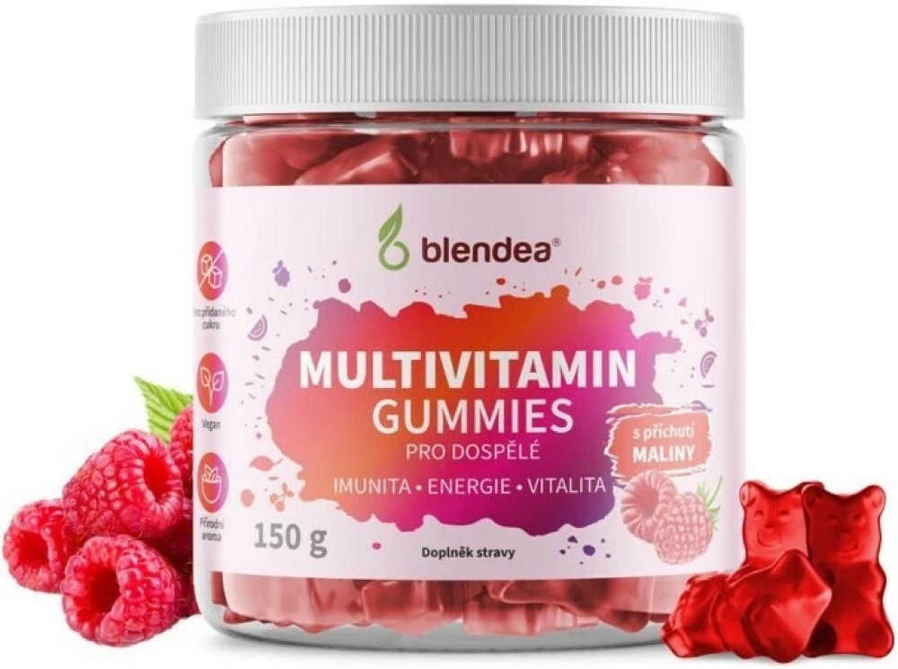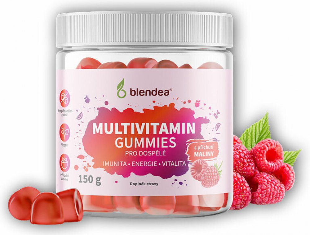 Vyzkoušejte multivitamínové Gummies Blendea pro dospělé, sladké želé bonbony s malinovou příchutí a vyváženou kombinací vitamínů a minerálů pro podporu imunity, energie a vitality. Samozřejmě zcela bez přidaného cukru.