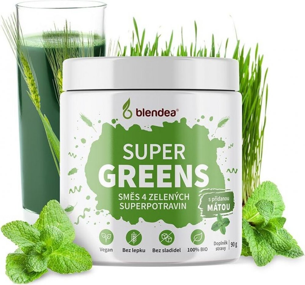 30% zeleného ječmene, 30% mladé pšenice, 20% spiruliny, 15% chlorelly, 5% máty