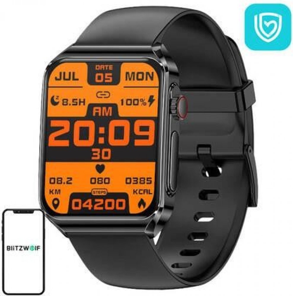 ManufacturerBlitzWolfModelBW-HL6ColorBlackBluetooth VersionBluetooth 5.1Compatible operating systemAndroid 4.4 and above, iOS 8.2 and aboveStrapSilicone or PU leatherWatch casePC+ABS with nano conductive electrodesDial size54.85x42.32x13.1mmStrap length269mmStrap width22mmWater resistanceIP67Additional FeaturesReminders: phone calls, messages, app notifications, Music control, Camera control, Alarm clock, Stopwatch, Weather, Custom dial, Brightness adjustment, Find phone, Do Not Disturb mode