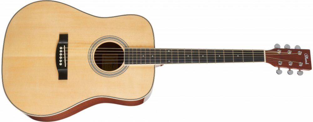 Akustická kytara Akustické kytary značky Blond jsou cenově dostupné nástroje vhodné pro začínající hudebníky. S jejich pomocí si osvojí základní techniky a dovednosti, navíc za cenu, která nijak nezatíží rodinný rozpočet. Blond D-OA NAT je akustická kytara s populárním tělem typu Dreadnought. Nabízí přední desku zhotovenou z vrstveného smrku, zadní desku a luby z vrstveného sapele, mahagonový krk a kobylku a hmatník z moderního kompozitního materiálu. Struny jsou přes plastový nultý pražec uchyceny v chromovaných ladicích mechanikách. Stylové zpracování podtrhuje nanesený lesklý lak a tradiční prvky v podobě světlé obvodové lemovky topu (ABS) doplněné černobílými linkami a rozety složené z černobílých linek.