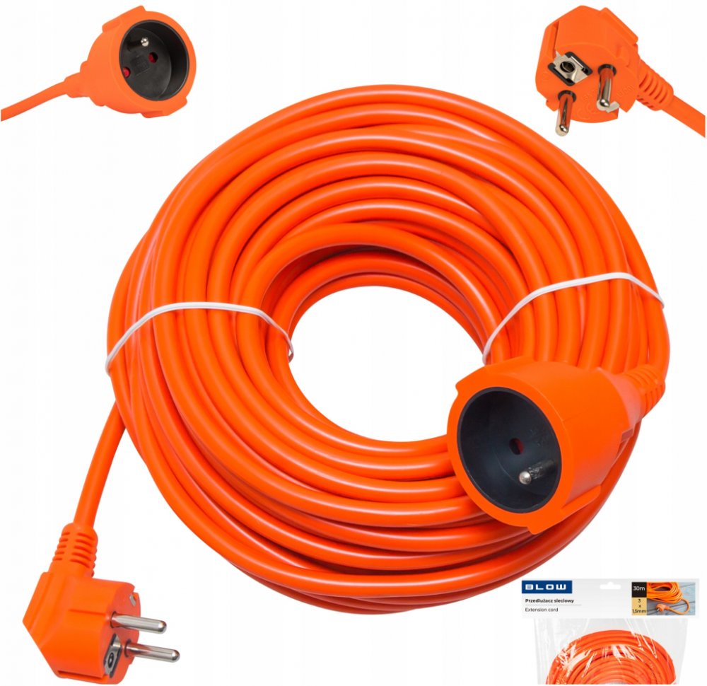 Prodlužovací Kabel síťový BLOW v oranžové barvě s jedním konektorem určený pro domácí použití. Kabel má na jedné straně zásuvku s uzemněním a na druhé straně jeden síťový konektor. Díky němu můžeme připojit elektrická zařízení, která jsou vzdálena až 30 metrů od zásuvky.