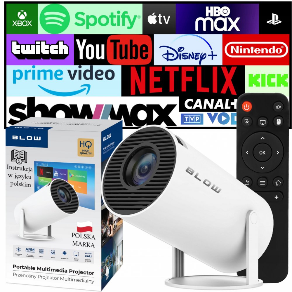 Projektor BLOW je moderní zařízení, které vám umožní sledovat filmy, programy, hry a další multimediální obsah na velké obrazovce. Projektor má vestavěný systém Android 11, který umožňuje přístup k mnoha aplikacím a online službám. K projektoru se můžete připojit pomocí Wi-Fi, Bluetooth, HDMI, USB nebo AV. Projektor má nativní rozlišení 720p a podporuje dekódování 4K, což zajišťuje vysokou kvalitu...