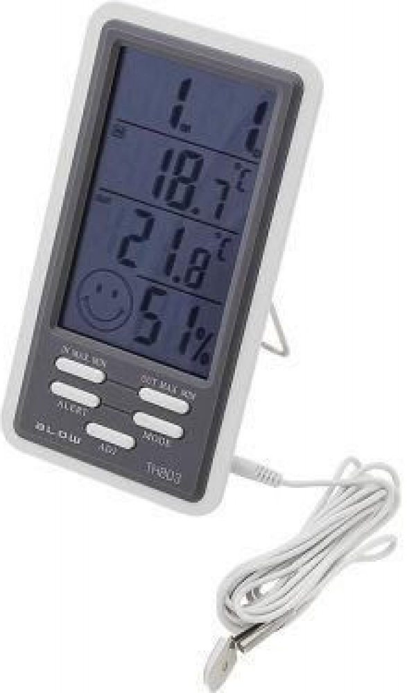 Na obrazovce najdete také grafický signál v podobě usměvavé či smutné tváře. Usmívá se, když je teplota mezi 18-25 stupňů a vlhkost 40-65% RH. Když parametry nespadají do těchto limitů, pak se na obrazovce objeví smutný obličej. Teploměr a vlhkoměr má také funkci alarmu v případě nízké nebo vysoké venkovní teploty.