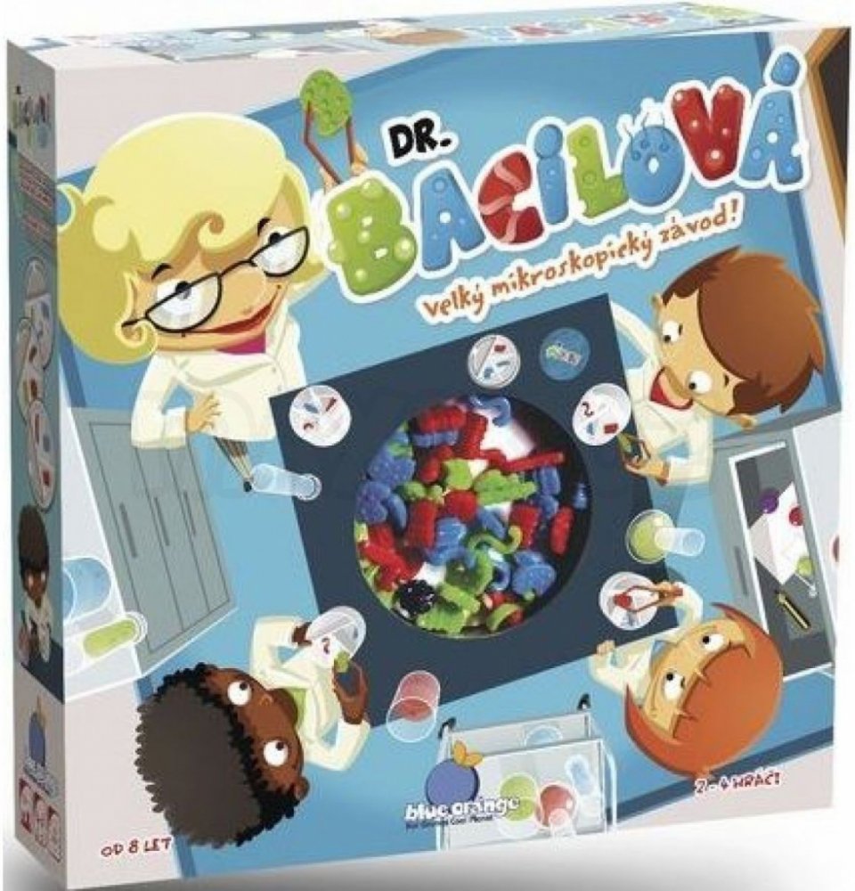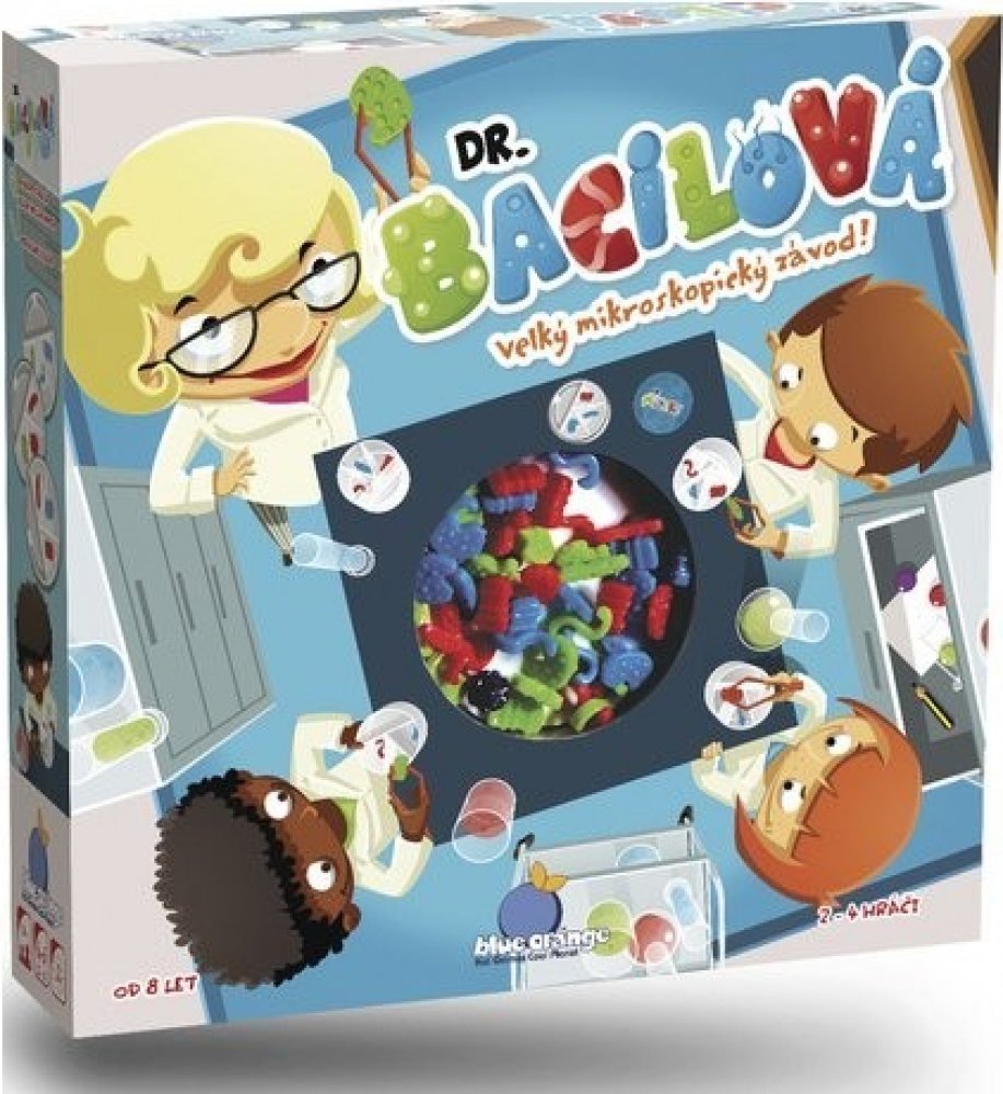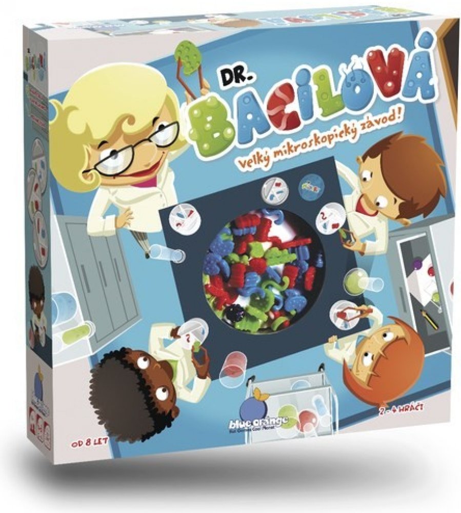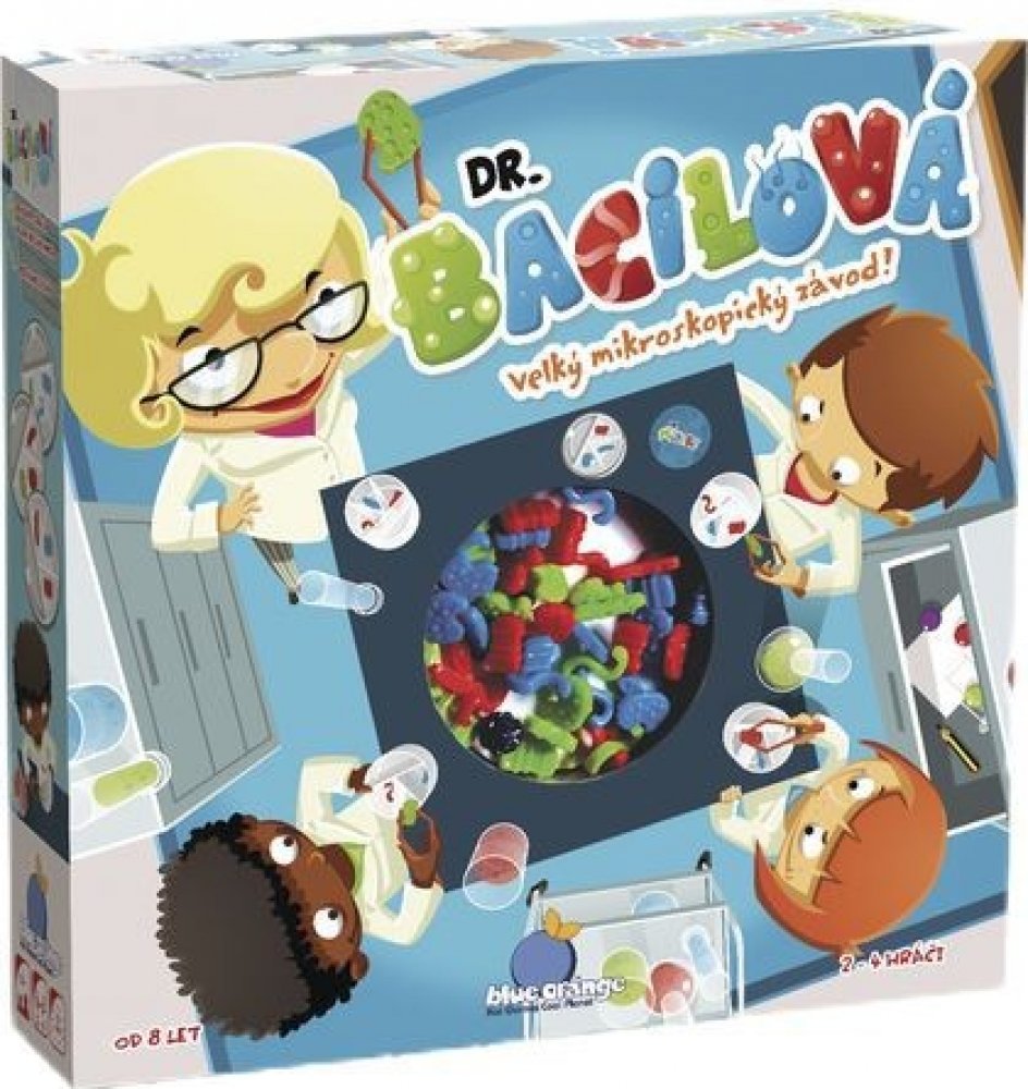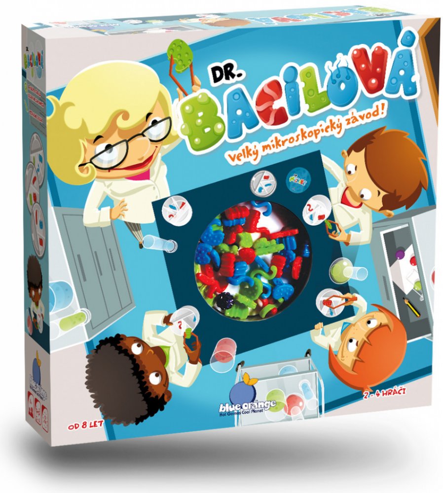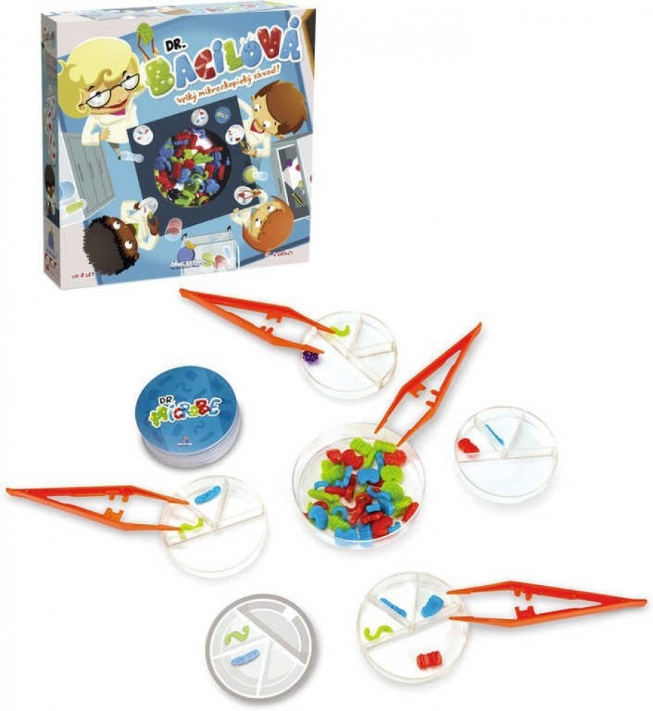 Obsah balení: pravidla, 54 karet zadání, 4 pinzety, 5 Petriho misek, 49 bacilů. Hra je dostupná v češtině a slovenštině.