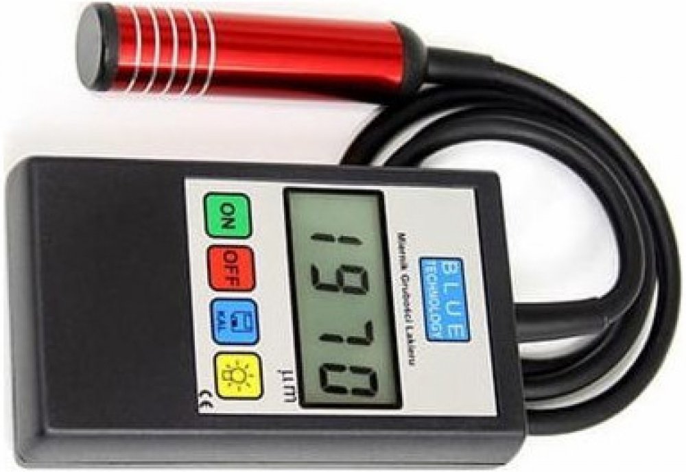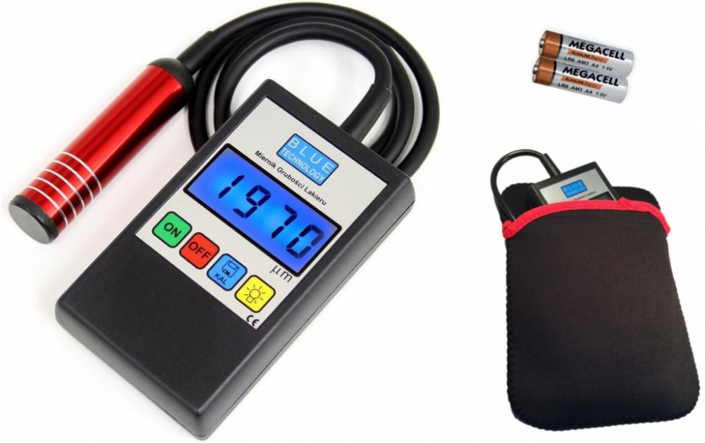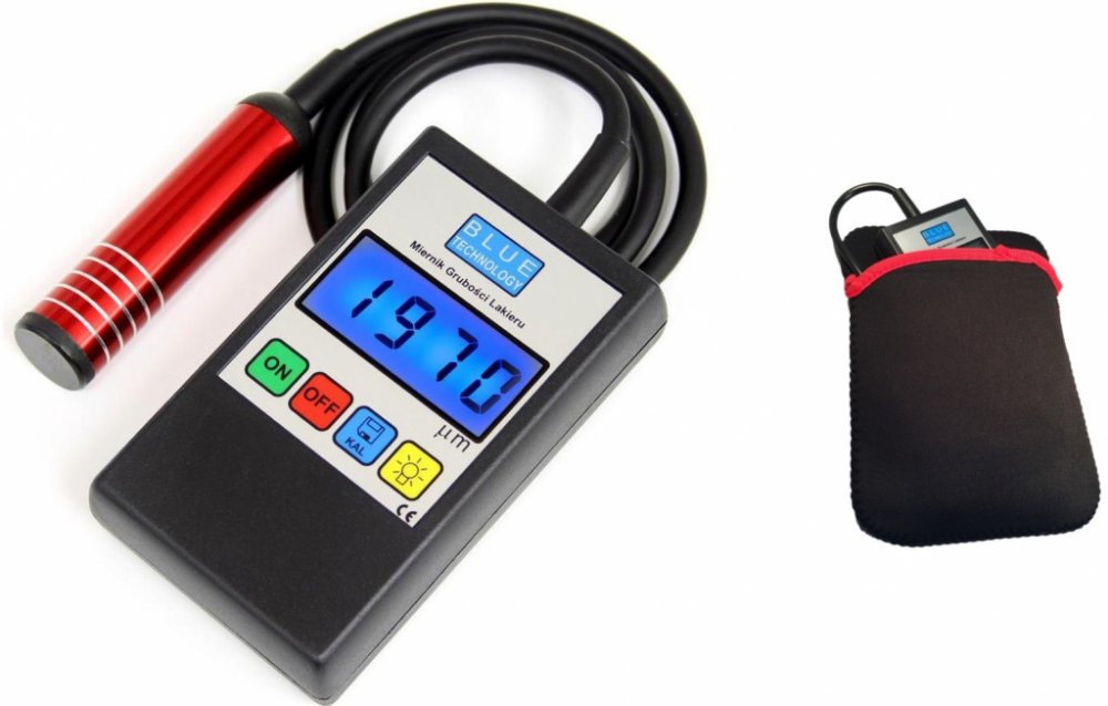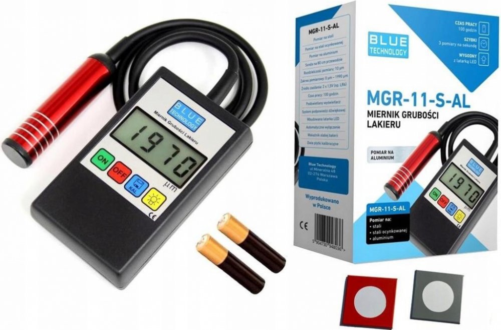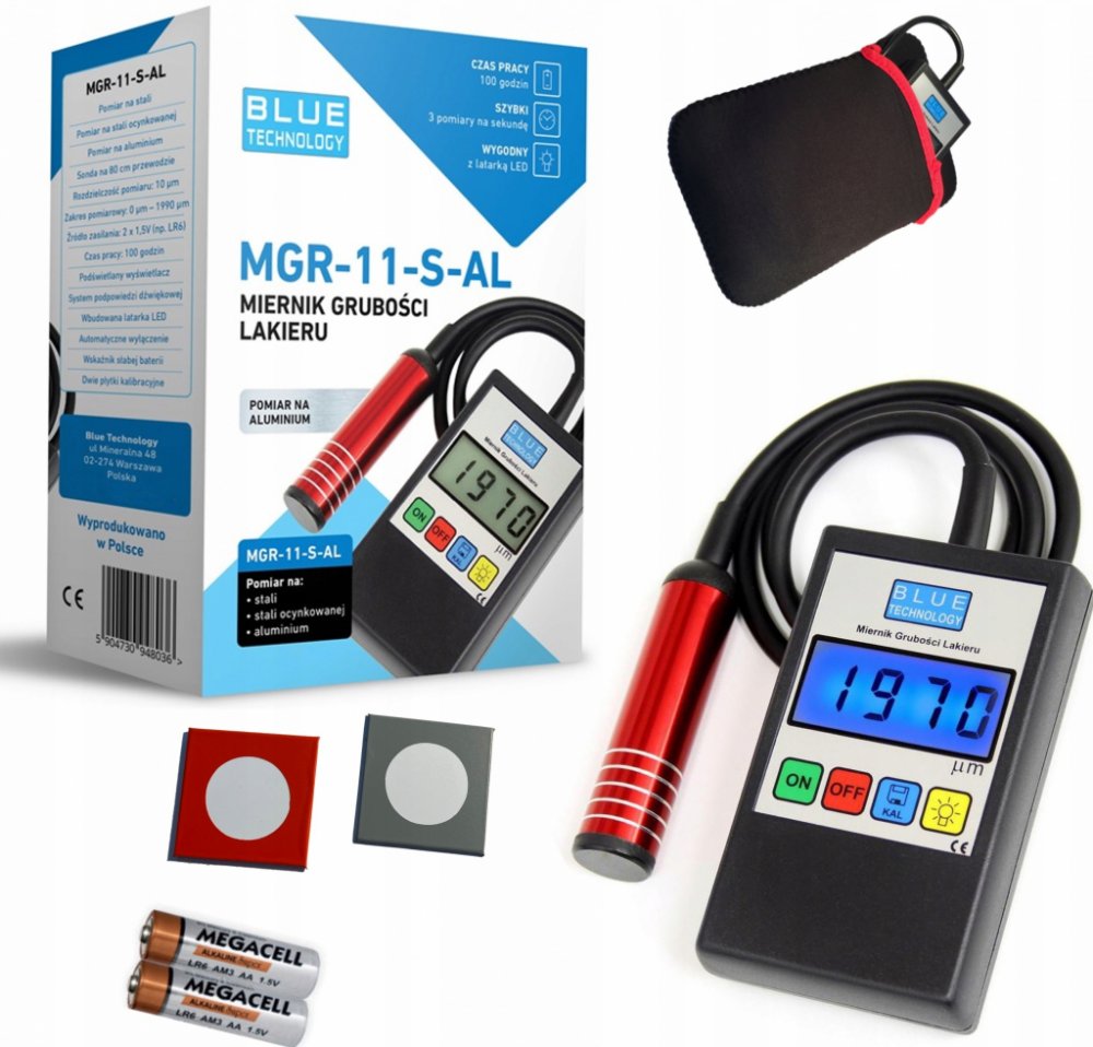 Měřič tloušťky laku MGR-11-S-AL byl navržen a přizpůsoben pro testování tloušťky automobilových laků. Měřič tloušťky laku MGR-11-S-AL automaticky měří na površích od: "FE" - pro ocelové a pozinkované ocelové povrchy "AL" - měření na oceli, pozinkované oceli a hliníku Rozsah měření od 0 do 1990 µm Rozlišení měření: Dva provozní režimy (nepřetržité měření / funkce HOLD) Zvukový alarm Napájení: 2 x 1,5 V (doporučené alkalické baterie, např. 100 hod. LR6) Provozní doba až 100 hodin Provozní teplota od -20?C do 40?C Automatické vypnutí po dvou minutách nečinnosti Kalibrace a kalibrační destičky jsou součástí dodávky Přístroj je certifikován CE Polský výrobek Sada obsahuje: 1: MGR-11-S-AL Měřič tloušťky povlaku Návod k použití v polštině 2 alkalické baterie LR6 - 1,5 V Kalibrační destička "FE" Kalibrační destička "AL"