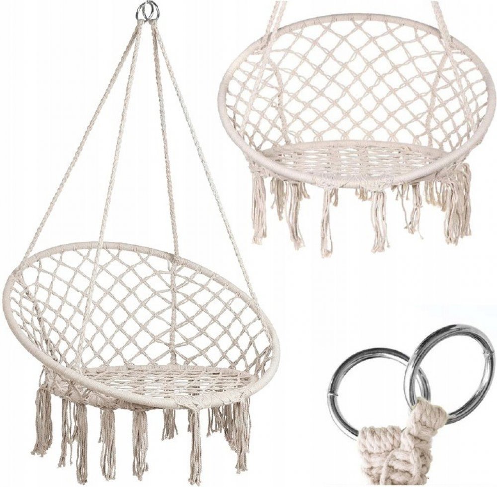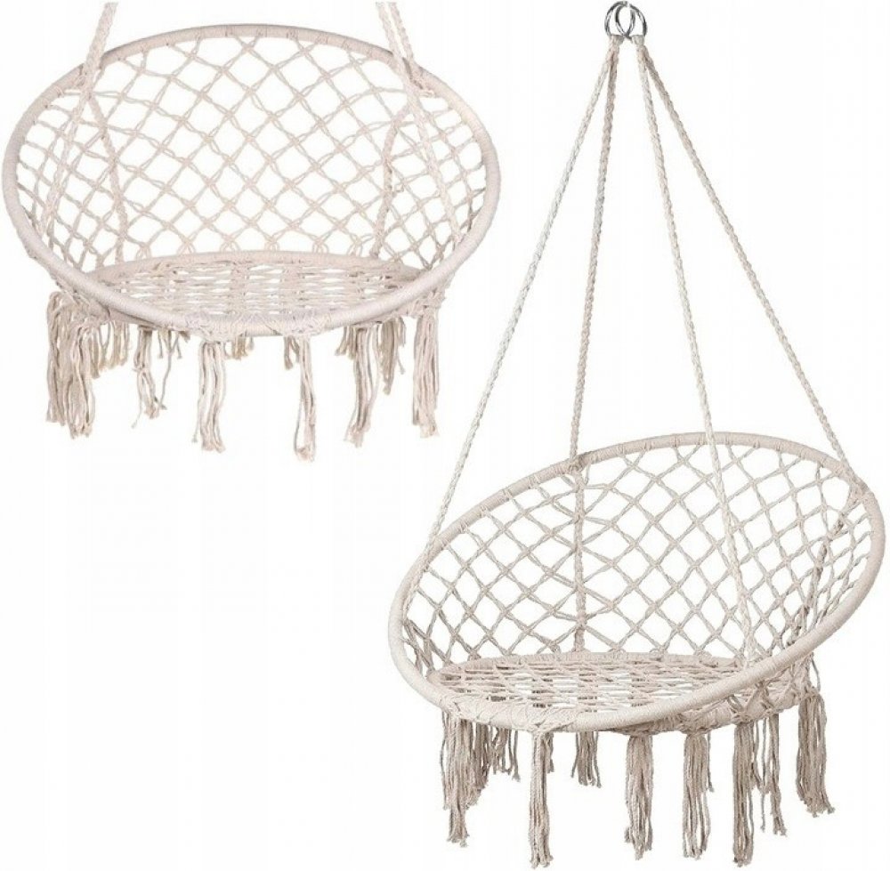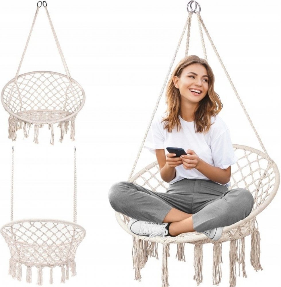 Vysoce kvalitní závěsná houpačka v boho stylu je vyrobena ze 2 kovových obručí a pletené šňůry odolné proti namáhání. Opěradlo je vybaveno 4 samostatnými lany, která umožňují zavěšení na jeden nebo dva háčky.