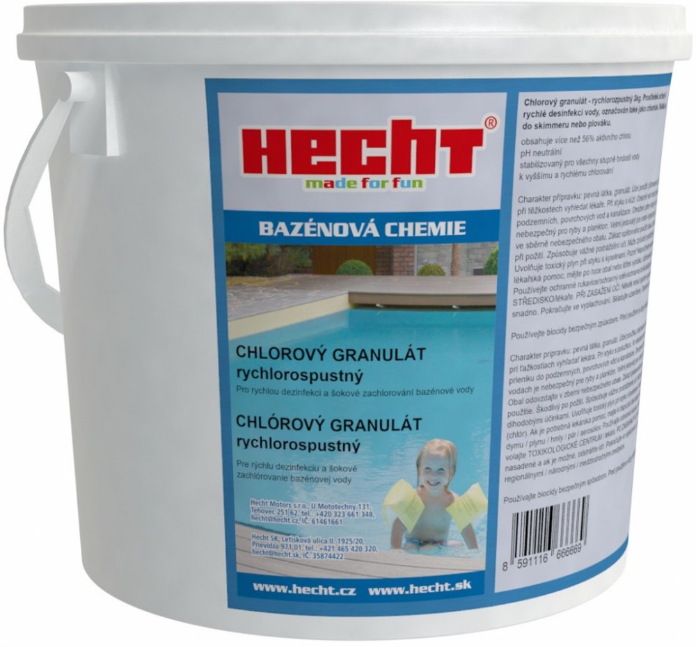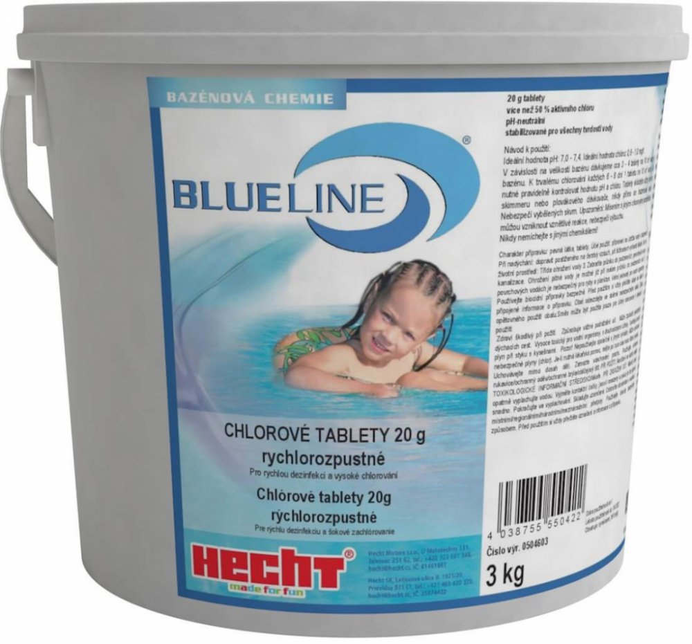 Nikdy nemíchejte s jinými chemikáliemi!Charakter přípravku: pevná látka, tablety, Účel použití: přípravek na údržbu vody v bazénech. Při nadýchání: dopravit postiženého na čerstvý vzduch, při těžkostech vyhledat lékaře. Vliv na životní prostředí: Třída ohrožení vody 3. Zabraňte průniku do podzemních, povrchových vod a kanalizace. Ohrožení pitné vody je možné již při malém průniku do podzemních vod. V povrchových vodách je nebezpečný pro ryby a plankton. Velmi jedovatý pro vodní organizmy. Používejte biocidní přípravky bezpečně. Před použitím si vždy přečtěte údaje na obalu a připojené informace o přípravku. Obal odevzdejte ve sběrně nebezpečného obalu. Zákaz opětovného použití obalu. Směs může být použita pouze pro účely stanovené v návodu k použití.Zdraví škodlivý při požití. Způsobuje vážné podráždění očí. Může způsobit podráždění dýchacích cest. Vysoce toxický pro vodní organismy, s dlouhodobými účinky. Uvolňuje toxický plyn při styku s kyselinami. Pozor! Nepoužívejte společně s jinými výrobky. Může uvolňovat nebezpečné plyny (chlor). Je-li nutná lékařská pomoc, mějte po ruce obal nebo štítek výrobku. Uchovávejte mimo dosah dětí. Zamezte vdechování prachu. Používejte ochranné rukavice/ochranný oděv/ochranné brýle/obličejový štít. PŘI POŽITÍ: Necítíte-li se dobře, volejte TOXIKOLOGICKÉ INFORMAČNÍ STŘEDISKO/lékaře. PŘI ZASAŽENÍ OČÍ: Několik minut opatrně vyplachujte vodou. Vyjměte kontaktní čočky, jsou-li nasazeny a pokud je lze vyjmout snadno. Pokračujte ve vyplachování. Skladujte uzamčené. Odstraňte obsah/obal v souladu s místními/regionálními/národními/mezinárodními předpisy. Používejte biocidy bezpečným způsobem. Před použitím si vždy přečtěte označení a informace o přípravku.