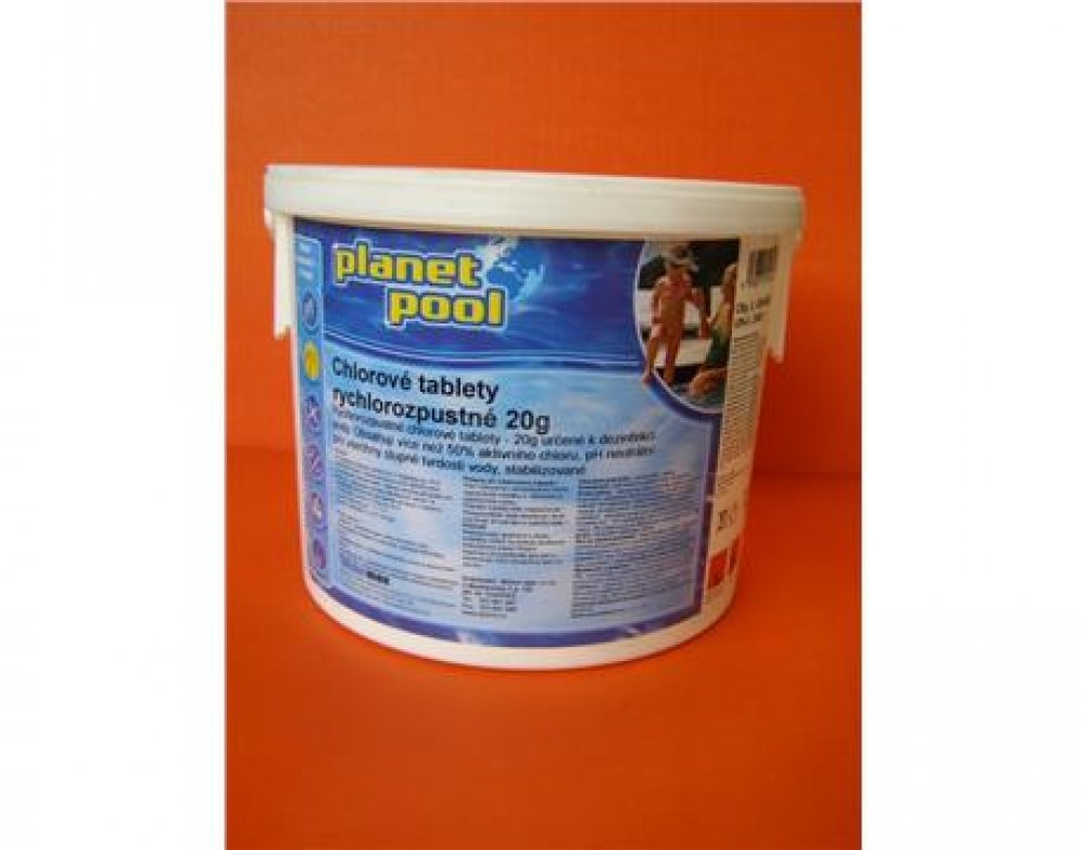 Chlorové tablety 20g - rychlorozpustné 3kg. Prostředek je určený k desinfekci vody. Vhodné do menších bazénů k postupné desinfekci rozpouštění v plováku nebo skimmeru.