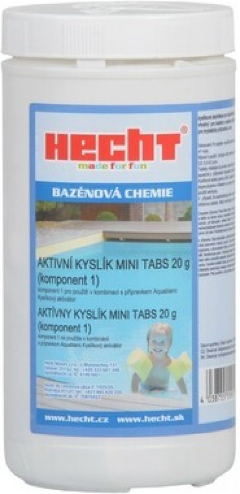 Aktivní kyslík mini tabs 20g. Desinfekční prostředek na bázi aktivního kyslíku v kombinaci s aktivátorem desinfikuje bazénovou vodu. Zabraňuje vzniku řas. Dlouhodobější účinek. Používejte biocidy bezpečně. Před použitím si vždy přečtěte etiketu a informaci o výrobku.