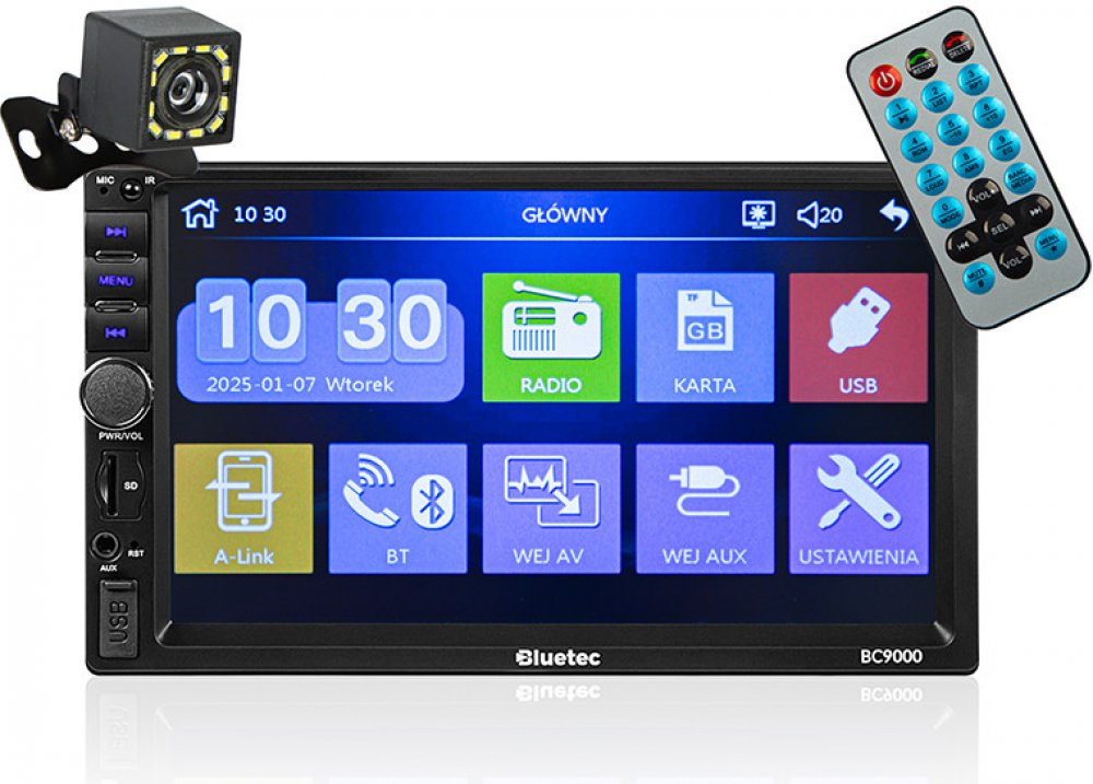 Multimediální systém do auta s možností přehrávání zvukových a obrazových souborů na 7" barevné dotykové obrazovce. Díky vestavěné funkci Bluetooth se rádio může připojit k jiným zařízením a vstup na paměťovou kartu a USB rozšiřuje možnosti zdrojů hudby a filmu. Přídavkem je FM rádio a AUX vstup. Použitý elegantní a moderní design znamená, že by se zařízení mohlo hodit do jakéhokoli interiéru a přiložené dálkové ovládání usnadní efektivní provoz.
