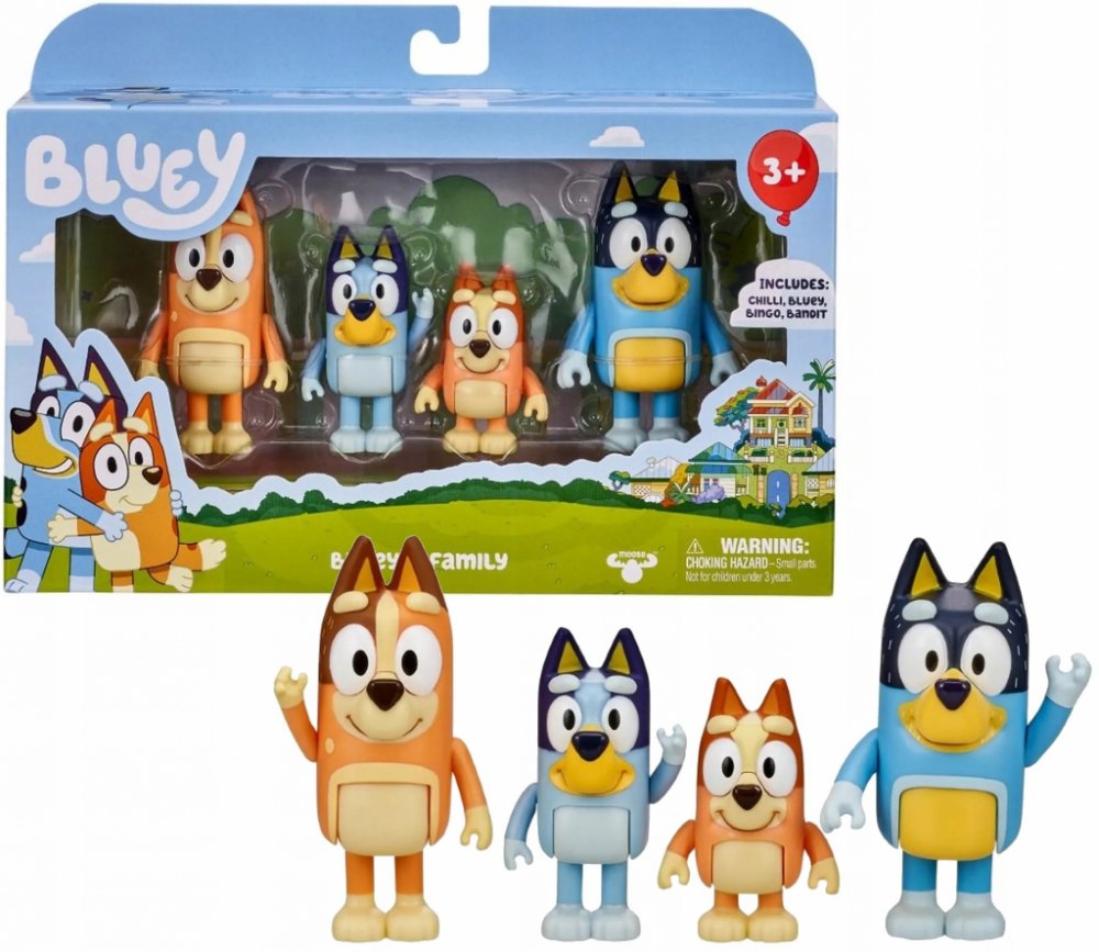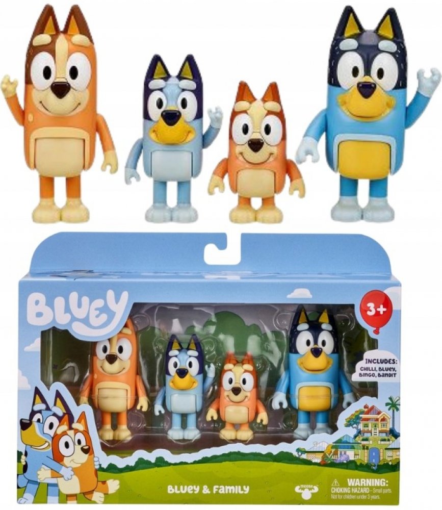 Objevte svět plný zábavy se sadou figurek z oblíbené dětské pohádky – Bluey! Tento rodinný balíček obsahuje dětmi milované postavy: rezolutní Bluey, její roztomilou sestru Bingo, starostlivého tatínka Bandita a milou maminku Chilli. Figurky jsou vyrobeny z odolného materiálu a jsou ideální pro malé ruce, které chtějí přenést kreativní hry z televizní obrazovky do svého pokoje.